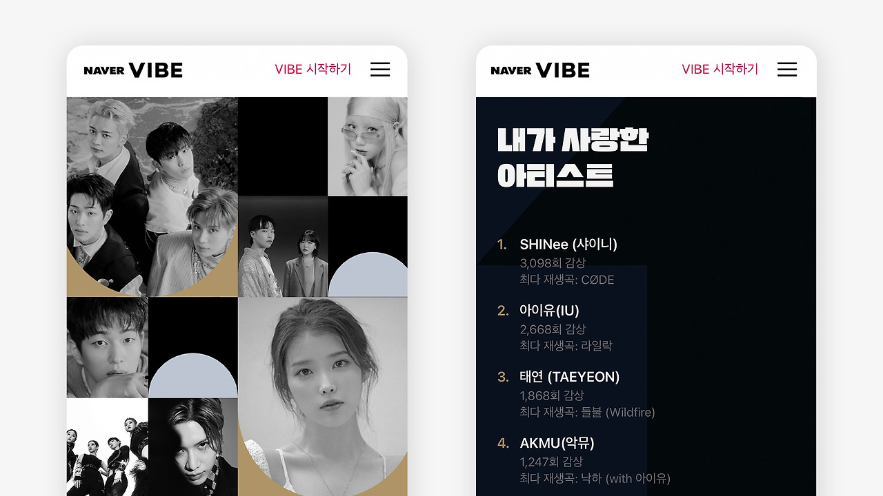 이번 연말결산에서도 말 그대로 바이브가 가진 바이브를 제대로 느낄 수 있었다. 가수 프로필 사진과 앨범 아트같은 서비스가 가진 소스를 십분 활용했다. 특히 종합적인 데이터를 보여주는 최상단의 메인 섹션(아래 첫번째 화면). 순위권에 든 가수들의 이미지를 패턴과 함께 애니메이션까지 넣어 완전히 커스터마이징을 했다. 알고리즘이 아닌 마치 사람이 직접 골라 정리해준 듯한 섬세함이 느껴지기도 했다.