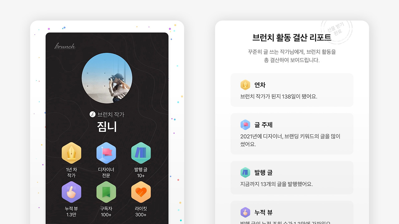 첫 번째 선물인 '브런치 활동 결산 리포트'. 모두 내 데이터이기 때문에 흥미로울 수 밖에 없지만 주제, 글 개수, 누적 뷰와 라이킷 수, 구독자 같은 정보는 다소 흔한 항목이라고 생각했다. 평소 들락날락하는 내 브런치 페이지에서도 쉽게 확인할 수 있는 정보이기 때문이다. 하지만 연차는 달랐다. 일단 쉽게 볼 수 없던 새로운 정보였고, '연차'라는 단어로 브런치의 '작가'를 잊지 않고 연결지었다. 정말 작가라는 직업인이 되어 브런치와 함께 했다는 느낌이었다. '선물'에 이어 '연차'까지, 사소하지만 강력한 Writing의 중요성을 여기서 또 한 번 느끼고!