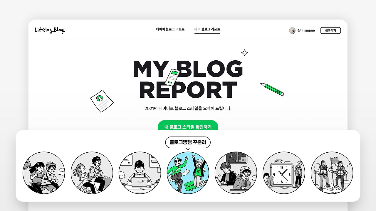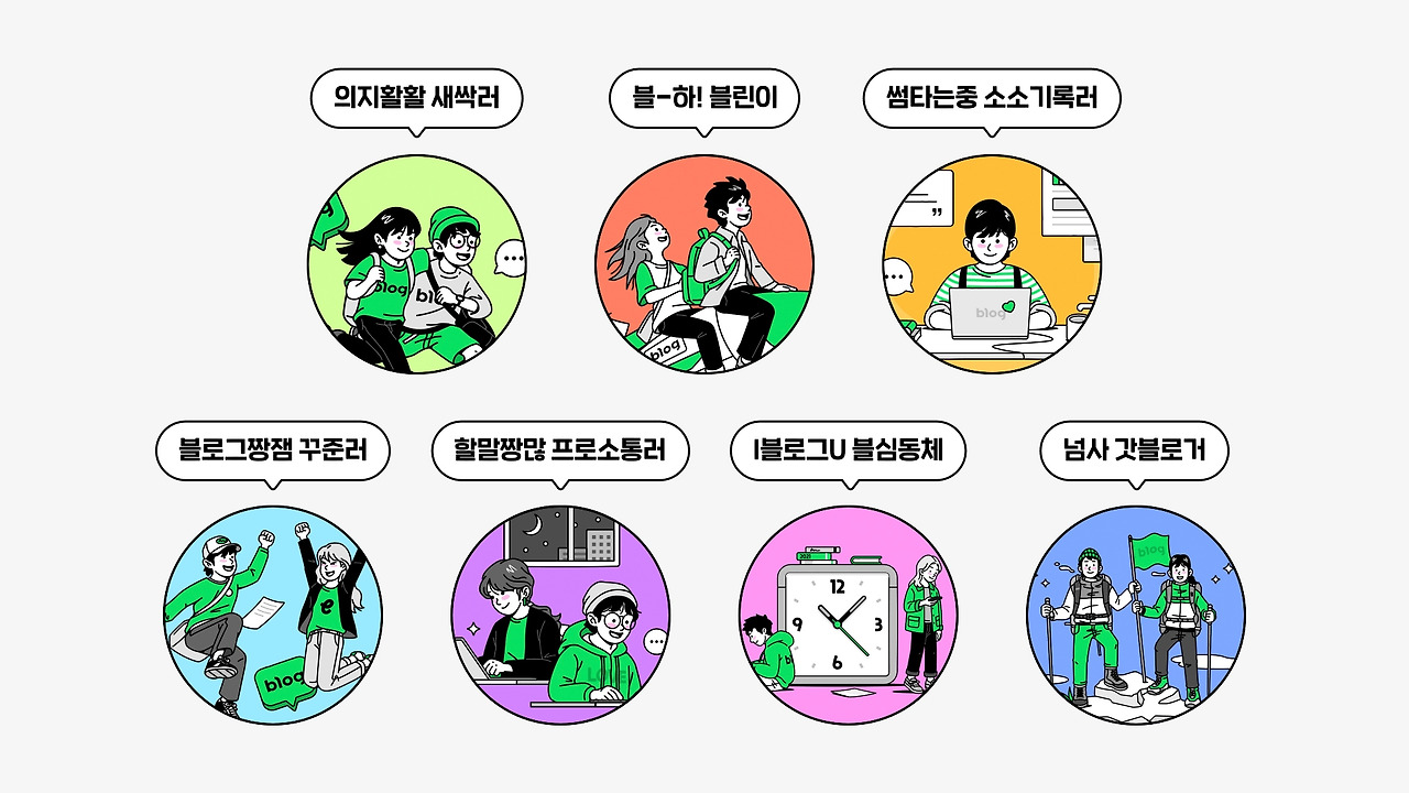 1년 간 작성한 글 개수를 기준으로 총 7개의 스타일로 나누고, '블하!', '할말짱많', '넘사' 같은 신조어를 조합해 재미있게 네이밍을 했다. 단순히 몇 개의 글을 썼다는 숫자보다 '스타일'을 전면에 내세웠다. 유사 서비스 중에선 유일하게 '팔로잉・팔로워'가 아닌 '이웃'이란 단어를 사용하는, 블로그만의 친근함을 느낄 수 있는 대목이었다.