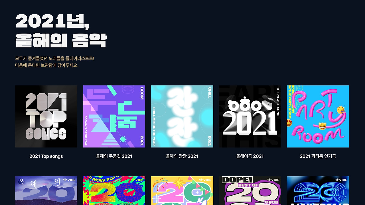 개인 데이터 말고 앱 서비스 전반의 데이터 즉, 트렌드 정보도 제공된 점이 바이브 연말결산의 또 다른 특징이다. '최애곡 모아듣기'와 '올해의 음악'에서 볼 수 있듯이, 음악과 더불어 소장하고 싶게 만드는 그래픽. 플리마다 개성 있는 그래픽 덕분에 음악을 단지 귀로 즐기는 것 뿐만 아니라 눈으로도 즐길 수 있도록 만든다.