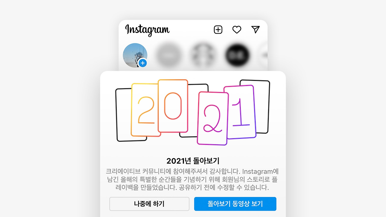 아마 사용 횟수로만 따지면 블로그보다 인스타그램 스토리를 더 자주 사용했고 더 많은 양의 콘텐츠를 생산했으리라 생각한다. 블로그는 좀 더 정제된 콘텐츠로 제작에 시간이 걸리는 반면에, 인스타그램 스토리는 단 한 장의 사진으로도 손쉽게 만들 수 있으니 말이다. 각 잡고 올려야 하는 피드와 비교해도 마찬가지다. 스토리로 발행하는 콘텐츠 수가 압도적으로 많을텐데 더 많은 사용자가 경험하게 하려면 스토리를 연말결산에 활용하는 편이 효과적이었으리라. 쌓인 데이터, 즉 볼거리가 많아야 버튼을 클릭하고 공유를 하는 액션으로 이어질 수 있을테니까.