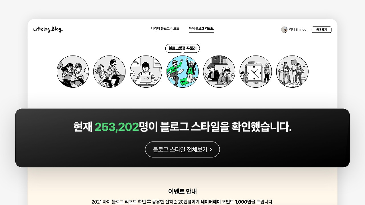 그런데 다시 한 번 살펴보니 스타일 이미지 아래 '블로그 스타일 전체보기'라는 버튼이 있더라. 선착순 이벤트라 몇 명이나 연말결산 리포트를 확인했는지를 보여주는 숫자에 집중한 나머지 어두운 등잔 밑을 보지 못했다. 리포트를 받아보는 순간부터 사용자가 꽤 궁금해 할 정보라고 생각했는데 접근성이 낮아서 아쉬웠다. 적어도 스타일 이미지 하나씩 클릭했을 때 개별 팝업이 나오게 만들었다면 좋지 않았을까 싶었다.