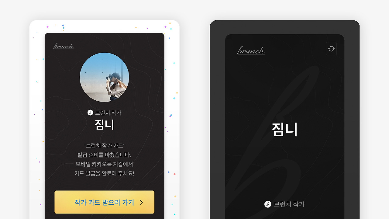 두 번째 선물인 '브런치 작가 카드'. 브런치 작가 카드는 발급을 신청하면 카카오톡 지갑과 연동된 장치다. 사실 브런치에서 연말 선물을 받기 전에 이미 카카오톡 업데이트 페이지에서 톡명함 기능을 봤다. 그땐 해당 기능에 큰 관심이 생기지 않았다. 평소 카카오톡 지갑을 잘 사용하지 않기 때문에 '굳이?' 라는 생각이 들었다.