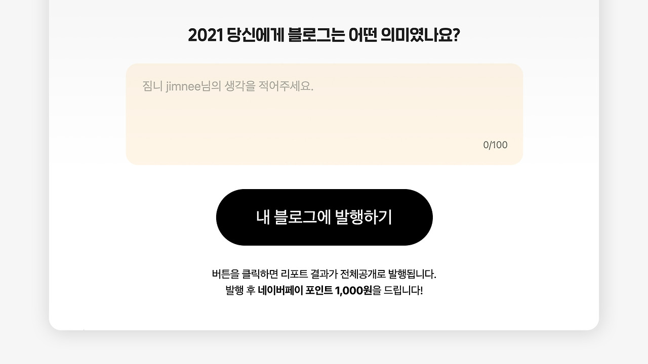 하지만 아쉬웠던 두 가지를 적어보면, 첫 번째는 리포트 발행 방식이다. 연말결산 리포트를 블로그에 전체 공개로 발행하면 네이버페이 포인트를 제공하는 이벤트를 함께 진행했다. 이벤트에 참여해 보고자 하단에 '발행하기'를 눌렀는데, 전체 공개는 고사하고 폴더 설정을 하지 못해 뜬금 없는 곳에 곧바로 올라가 버린 게 아닌가.