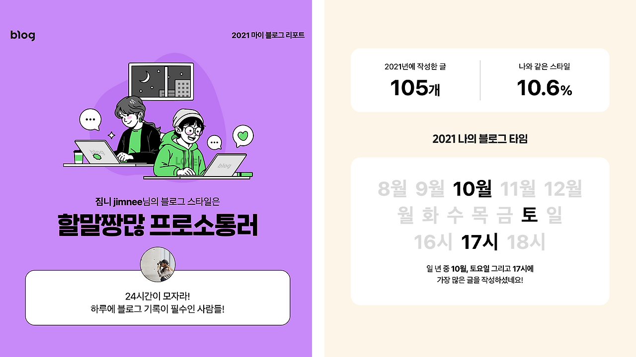 그외에도 주로 발행한 시간이 언제인지부터 가장 높은 인기를 받았던 글, 공감수와 댓글수, 유입 키워드까지, 항목을 다채롭게 구성해 볼거리가 꽤 많았다.