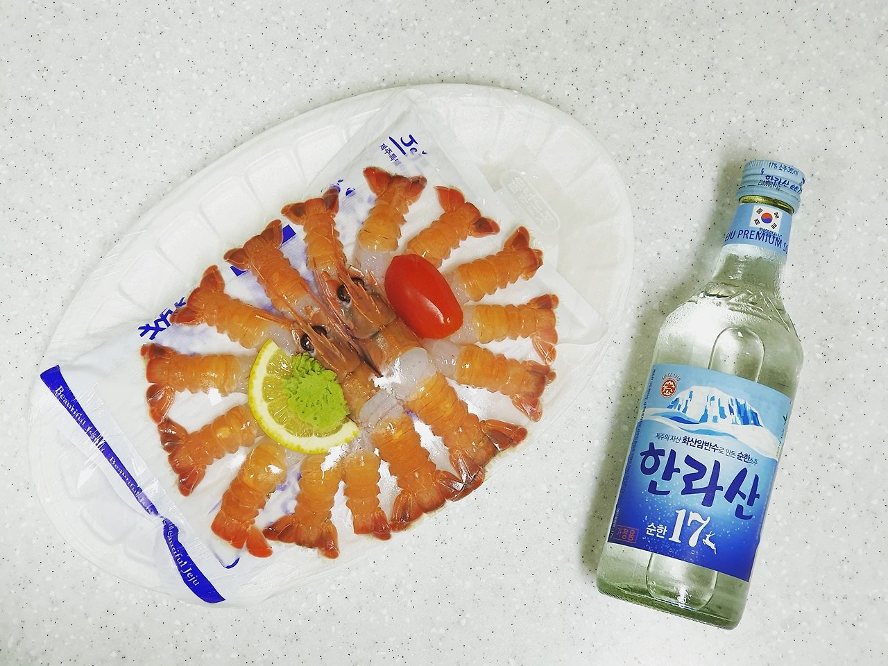 그냥 오기엔 딱새우회가 아까워 편의점에 들러 라면 한 봉과 한라산 소주(알쓰용 순한 맛)도 한 병 산다.