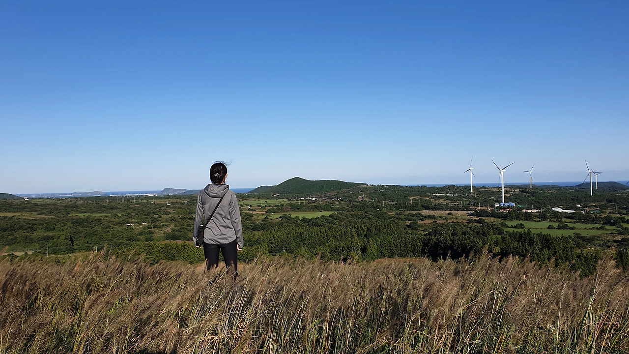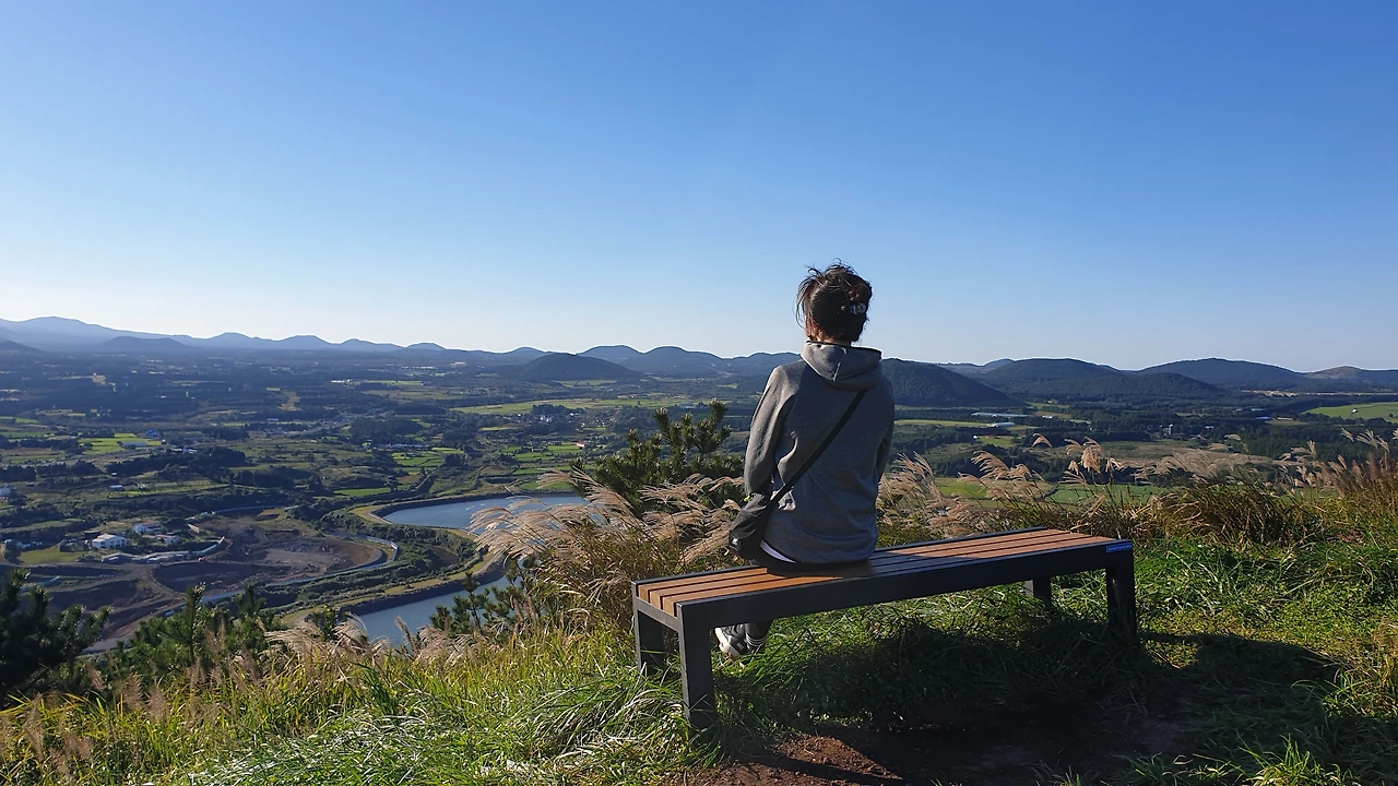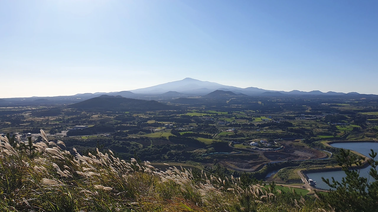 멀리 한라산부터 크고 작은 오름들이 한눈에 보이고 뒤편의 성산일출봉까지 돌아보는데 눈에 거슬리는 것 하나 없이 시원하게 펼쳐있다.