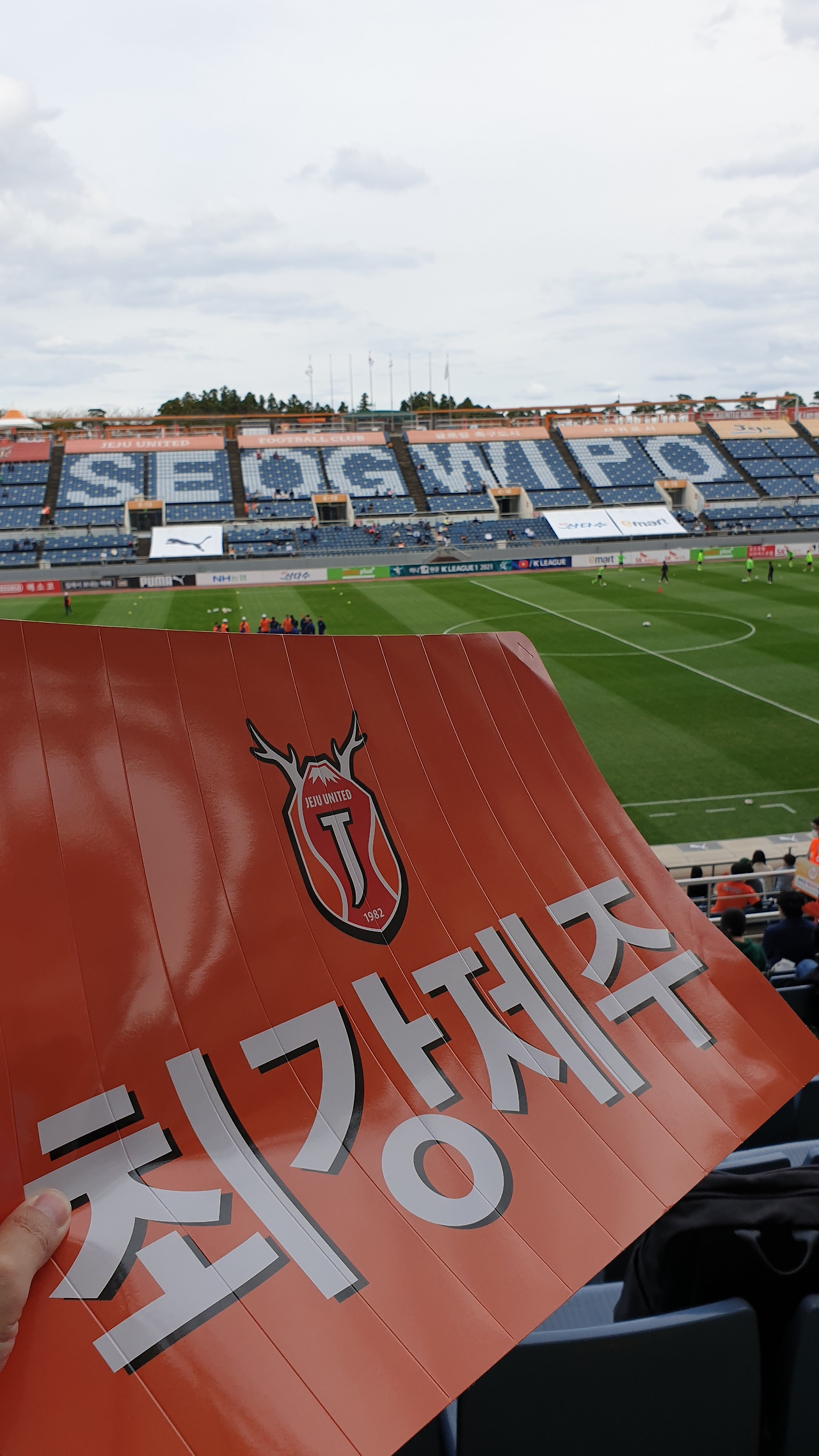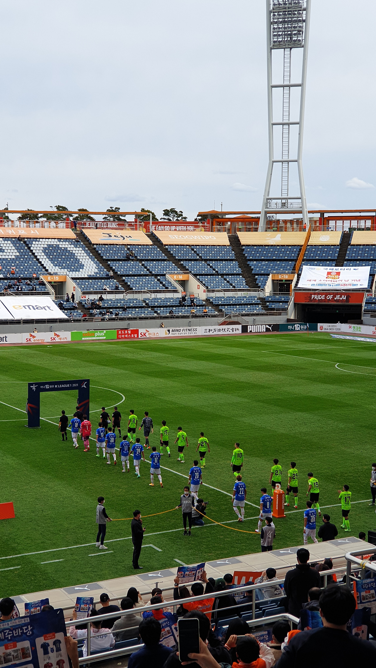 숙소가 서귀포 월드컵 경기장 바로 앞인데 매일 경기장을 지나다니기만 하기 좀 겸연쩍어서 경기 일정을 알아보았더니 마침 재밌을 것 같은 경기가 있어 예매를 해두었다. (응원하는 팀이 있어 코로나 전까지는 야구장 직관은 1년에 한 번은 다녔고 미국에서 농구장도 가봤는데 축구장은 난생처음!).