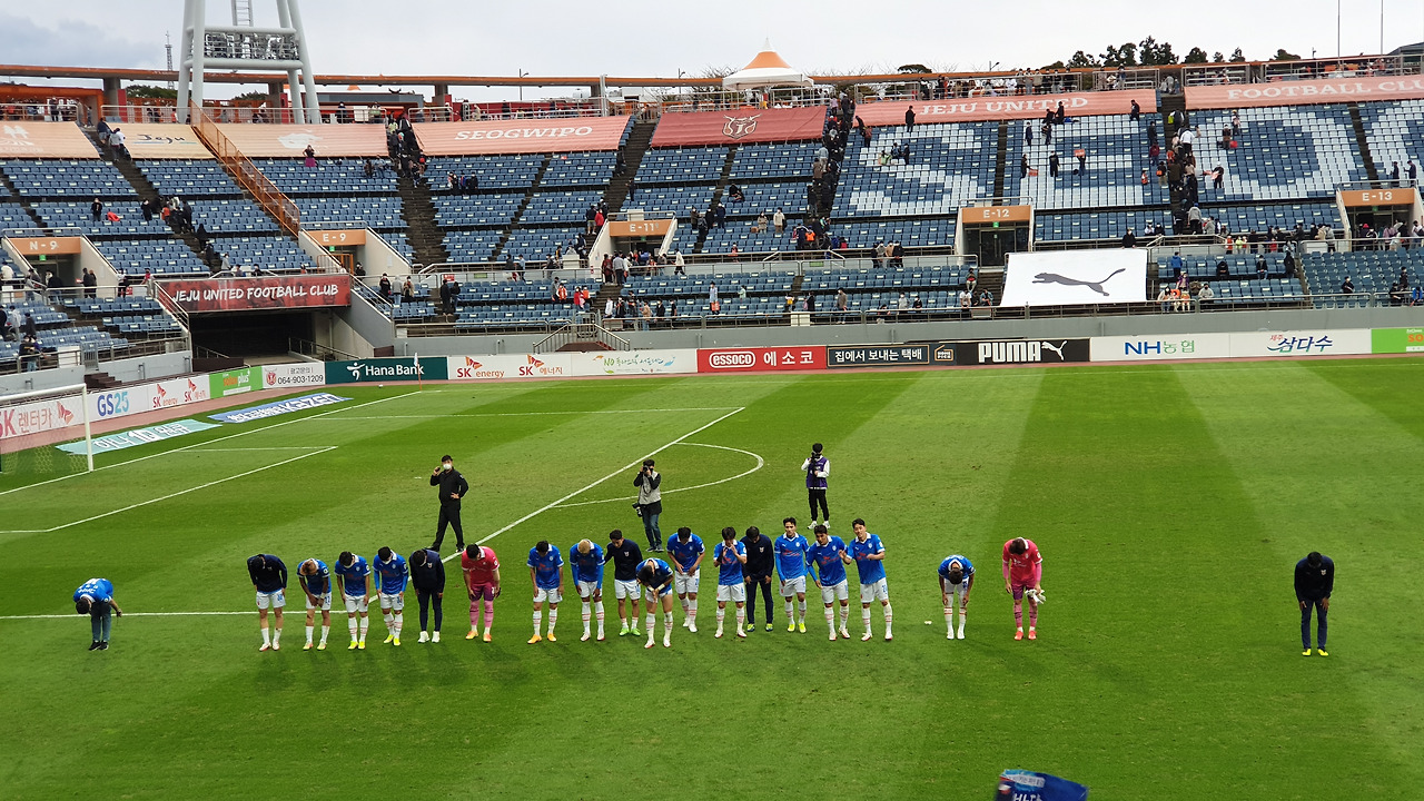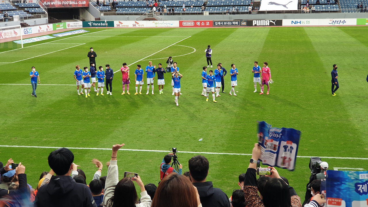 내심 실망한 관중들에게 장내 아나운서가 "우리는 극장골을 보여준 적이 있습니다. 오늘도 할 수 있습니다. 다 같이 최강제주를 응원합시다!"라는 멘트에 모두 한마음으로 장단에 맞춰 응원을 보낸다.