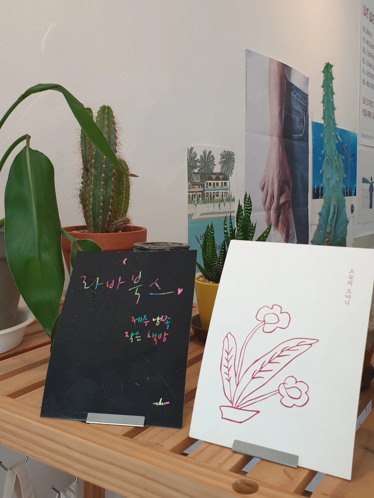 서울에서 보던 독립서적들도 꽤 보이고 제주의 특색을 살린 엽서책, 여행 관련 책과 다양한 굿즈들이 많은 아기자기한 동네서점이다.