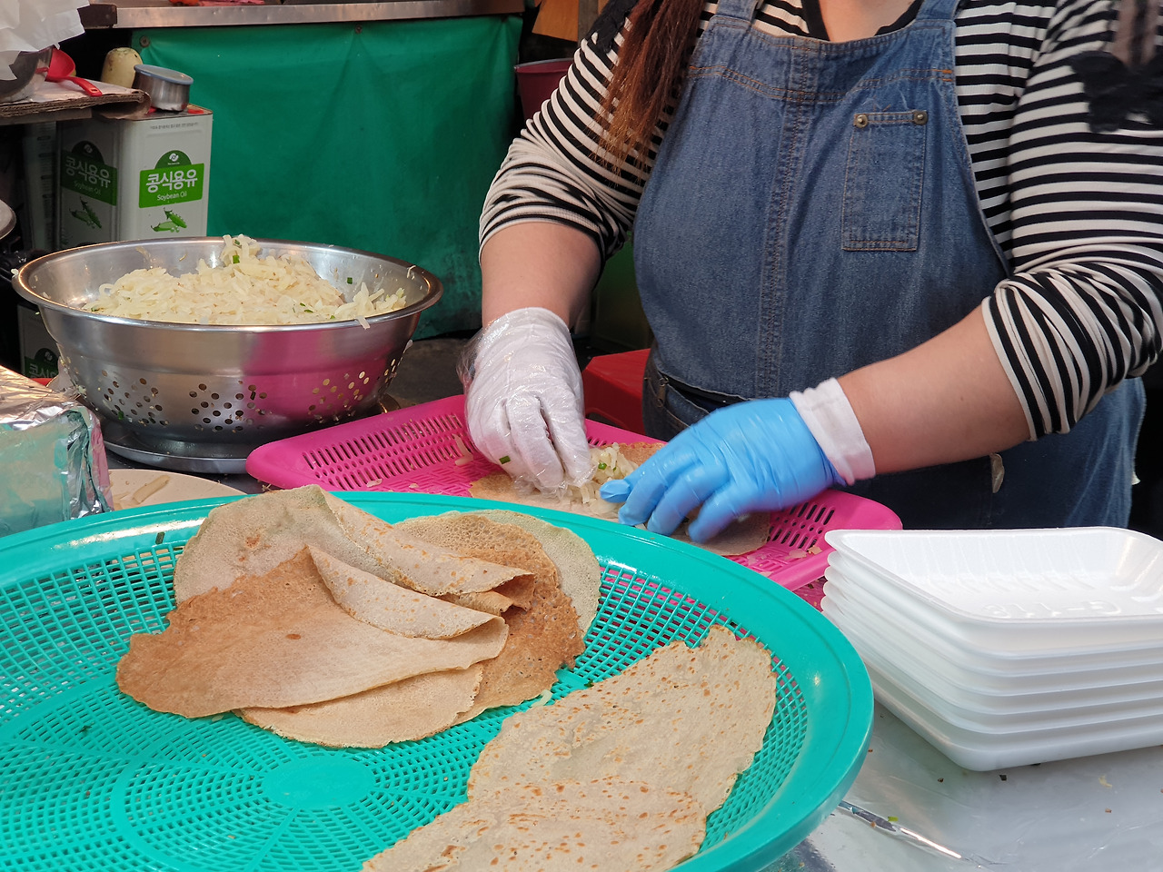 시장을 둘러보며 제주향토음식이라는 빙떡도 맛본다. 메밀전병과 비슷한데 강원도식은 속이 김치로 매콤한 맛인데 반해 제주도식은 무나물 비슷한 속을 채워 넣어 슴슴하고 담백하다.