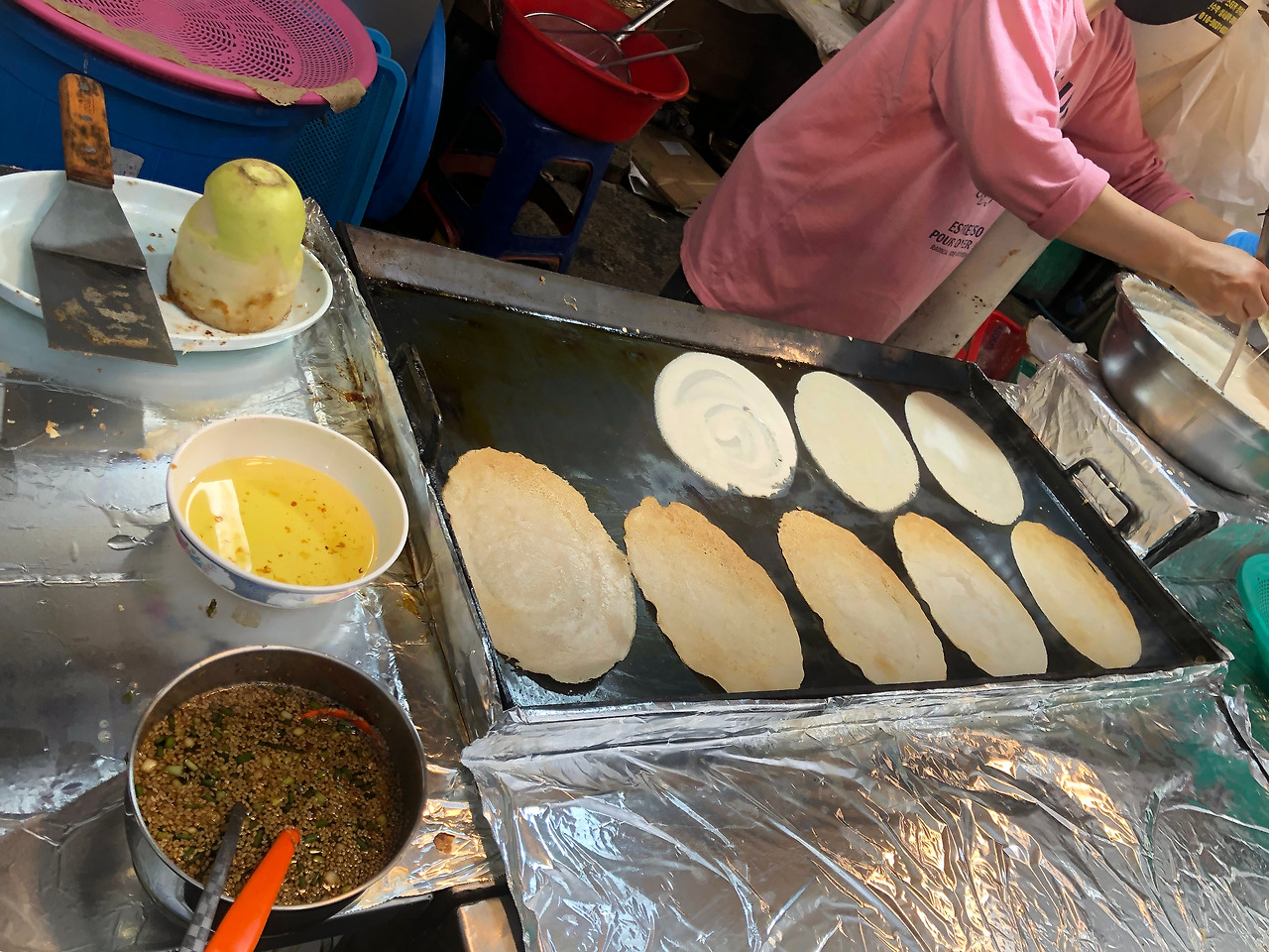 절반쯤 잘린 큰 무로 철판에 식용유를 바르는 모습이 인상적이었다.