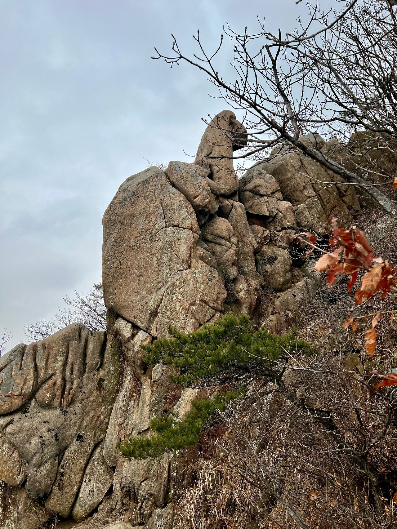 3봉에서는 지나온 1봉과 2봉을 어여쁘게 돌아볼 수 있고 비록 흐린 곰탕 날씨였지만 멀리 바다도 내다보인다.