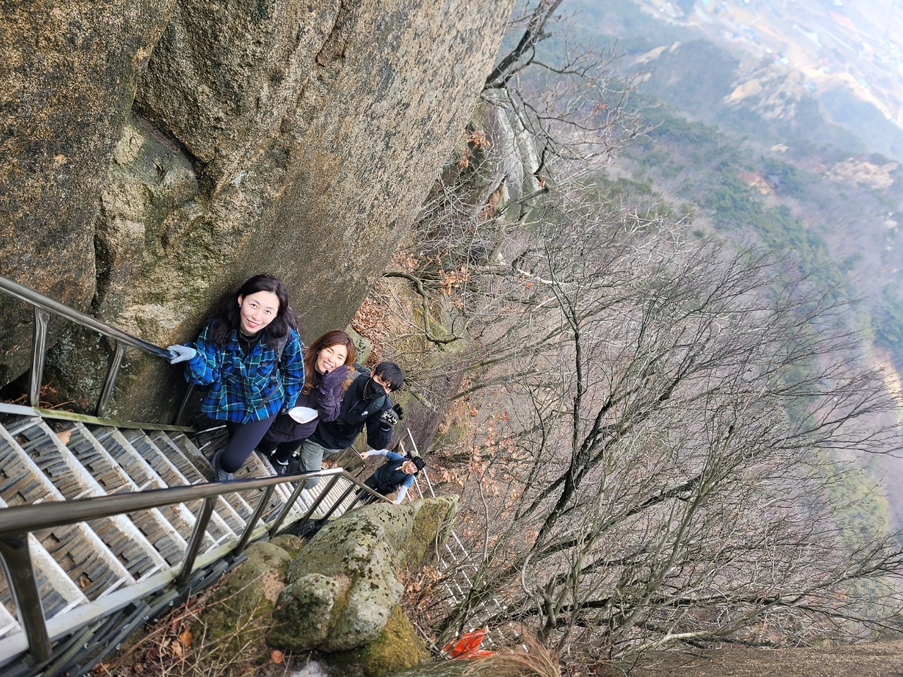 마치 사다리마냥 가파른 계단을 오르고, 손과 발을 모두 활용해 암릉 구간도 씩씩하게 기어오르고 가방마저 던져버리고서야 간신히 빠져나오는 용굴을 기어 나와 드디어 만난 정상석!