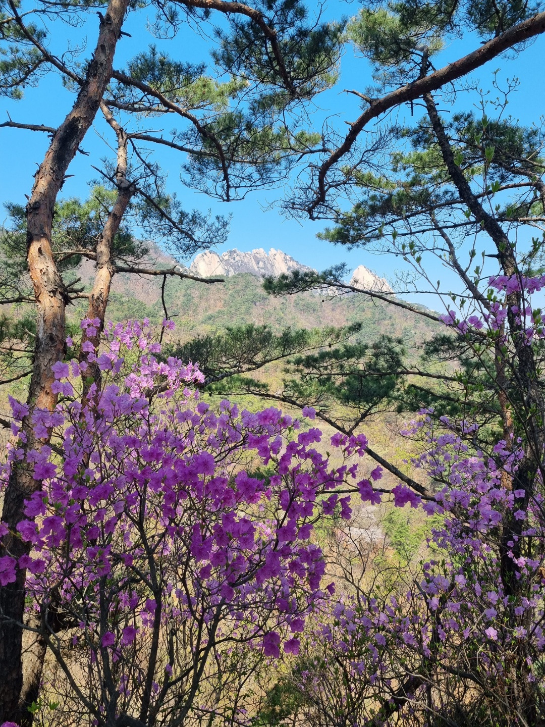내려오다 다시 올라서인지 슈가 하이가 이제 다 바닥난 것인지 조금 힘에 부치는 느낌도 들지만 진달래능선보다도 훨씬 더 풍성한 진달래 꽃길 덕에 조금이나마 응원받는 느낌으로 한발짝씩 디뎌본다.