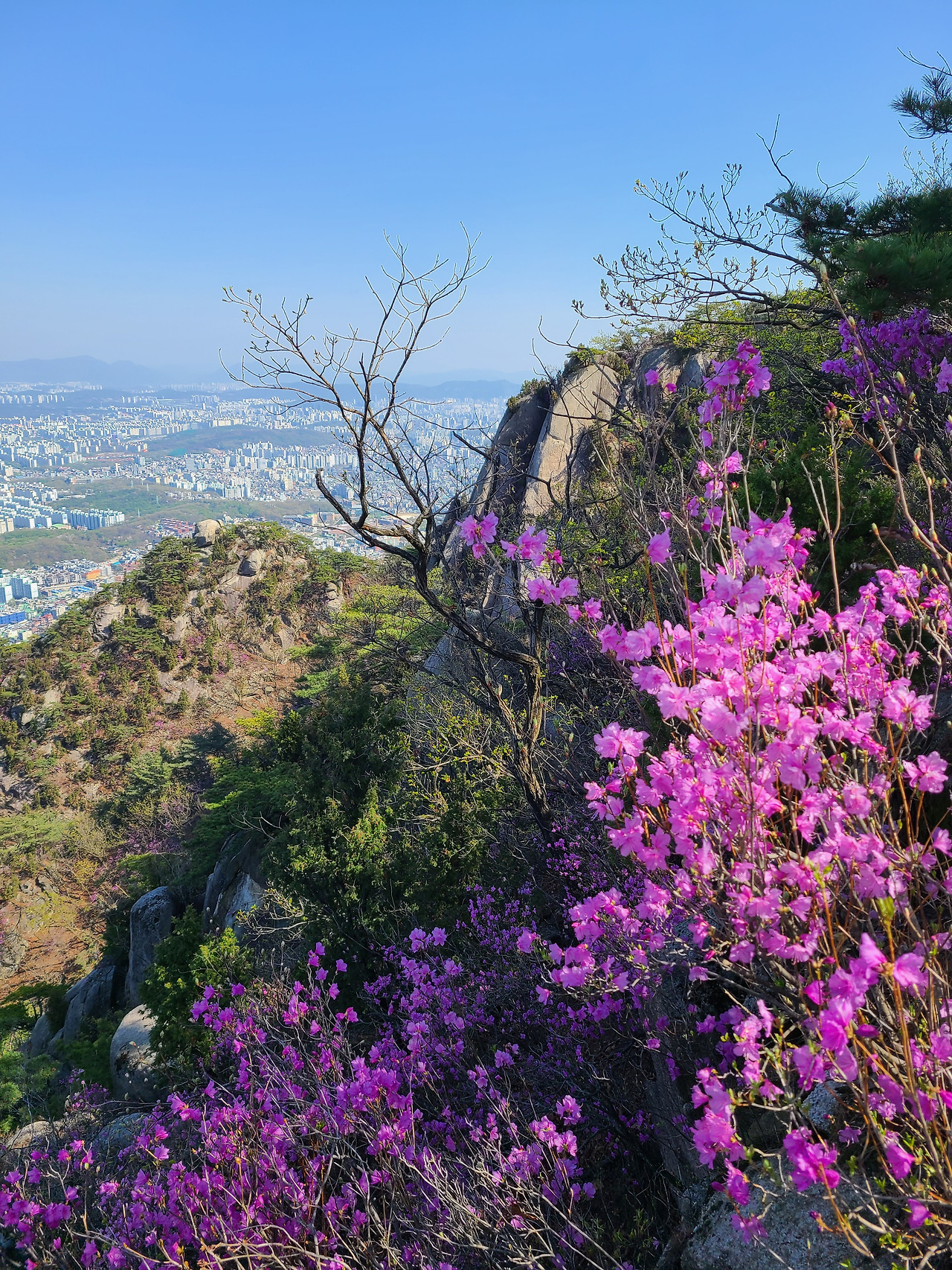 워밍업도 안 된 상태에서 초반 업힐을 하다 보니 숨이 턱턱 막히지만 진달래꽃 사이로 보이는 북한산 조망을 눈요기하며 업업!
