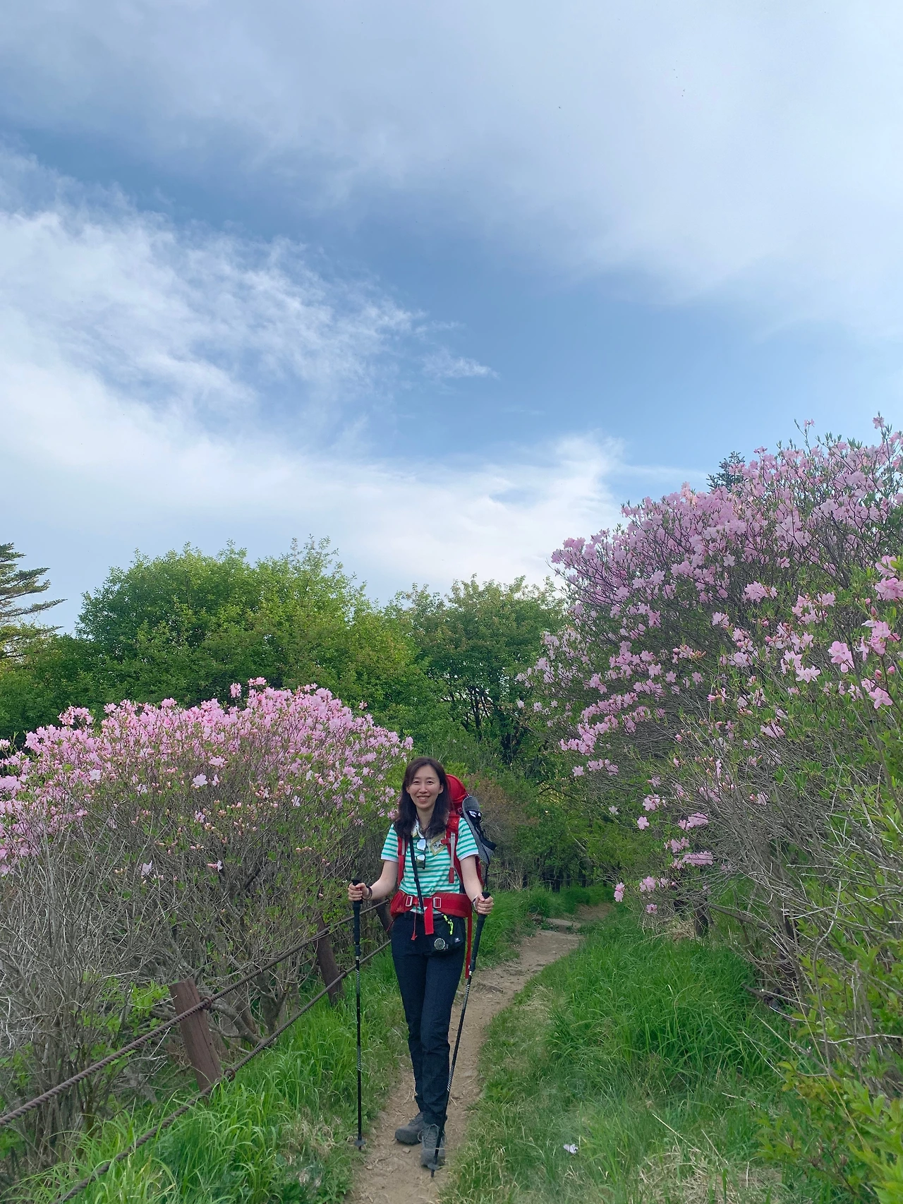 버거를 먹고 다시 배낭을 추스르는데 덜렁거리는 헤드쪽에 침낭을 최대한 조여주고 허리끈도 바짝 졸라매니 한결 힘이 덜 드는 듯하다. 잠시 깔딱도 지났지만 그래도 위쪽에는 연달래가 만발해서 사진도 종종 찍어주며 살랑살랑 올라간다.