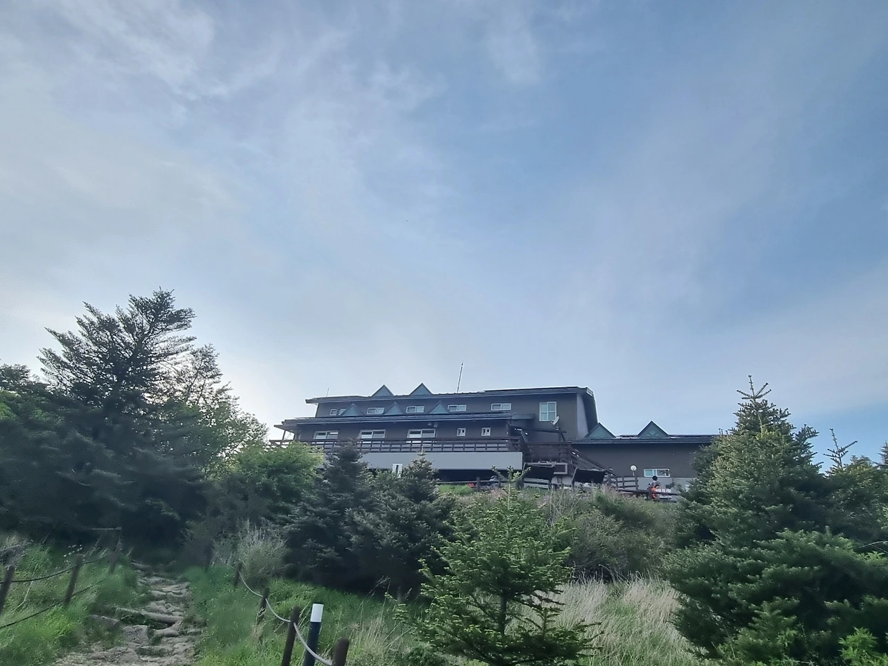 어느 순간 위를 쳐다보는데 나무가 아니라 파란 하늘이 보이며 마치 숲 속의 별장처럼 아름답게 등장한 세석대피소와 그 아래 약수터.