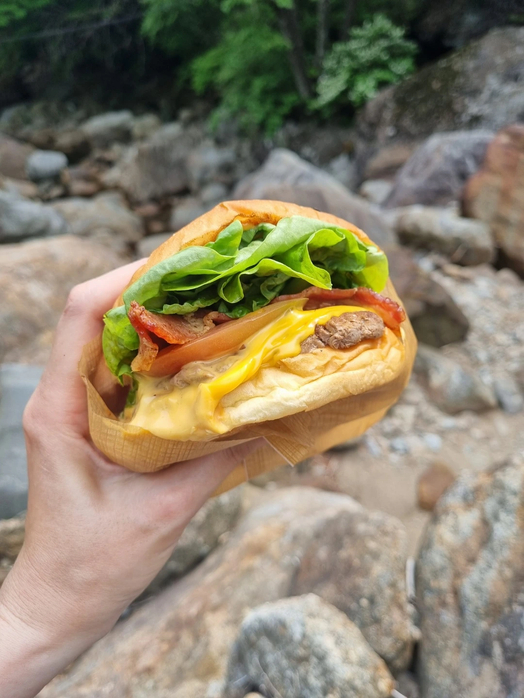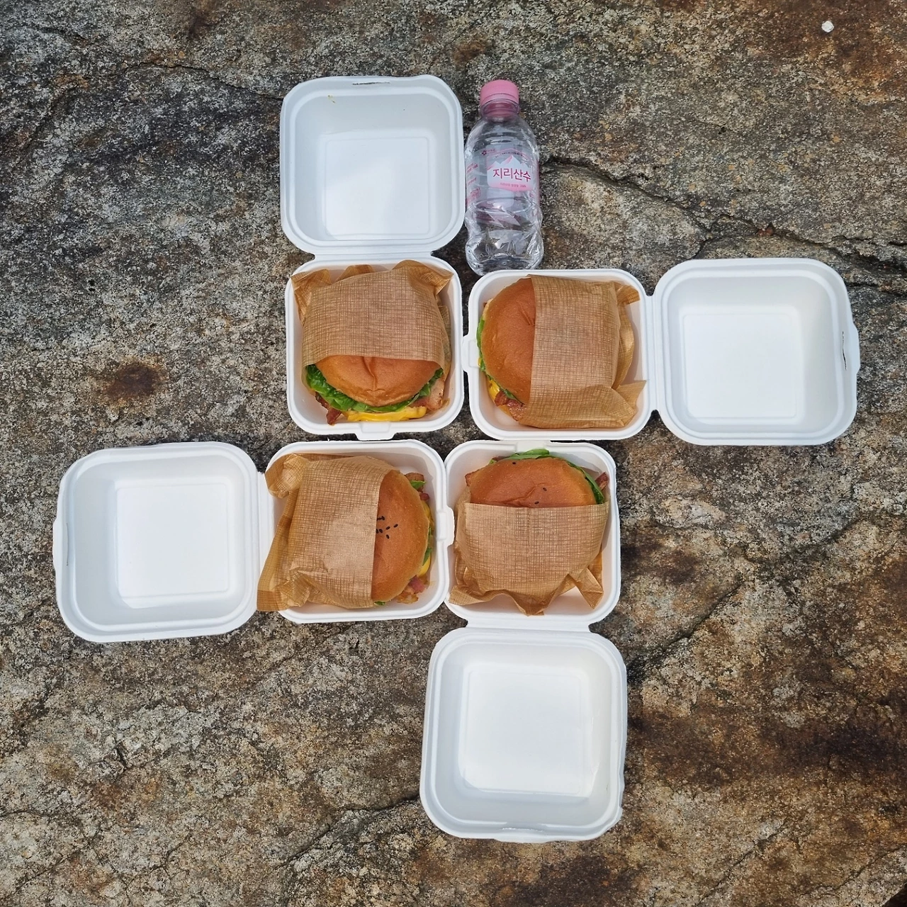 내 상태를 본 일행들이 버거라도 먹고 가자며 오른 지 30분 만에 계곡에 자리를 잡았고 나도 덕분에 숨을 돌리기로 했다.