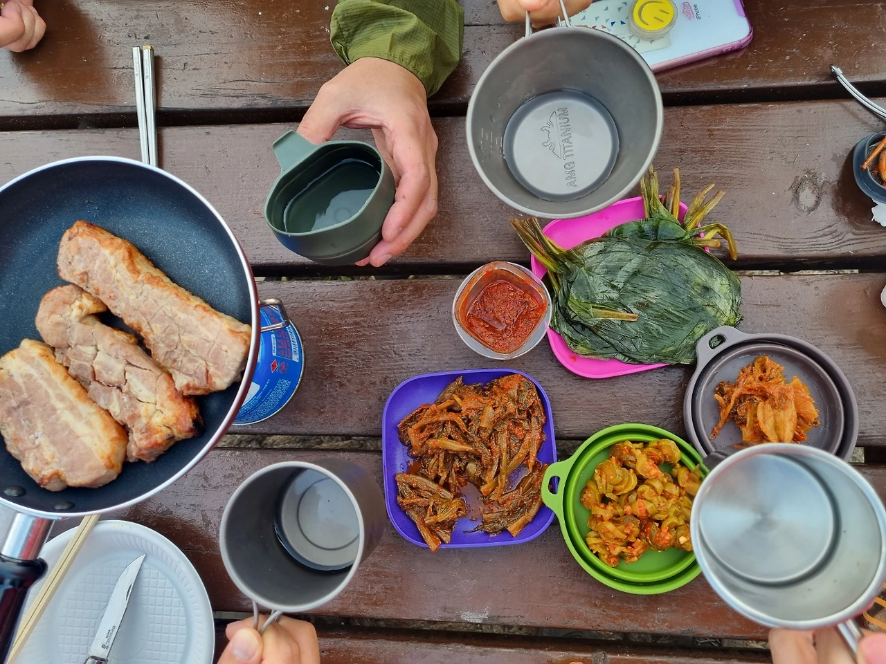 초벌된 삼겹살은 후라이팬에서 지글지글 금방 익어 오래 기다리지 않고 먹을 수 있어 좋았고 어젯밤 우리 집 냉장고에서 주섬주섬 챙겨간 고기 친구들 (명이나물, 갓김치, 토하젓)도 인기가 많아 다행이었다.