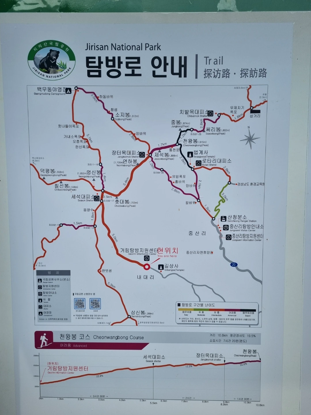 1. 난이도: 5 (천왕봉-중산리 하산길은 지도상에도 검정색 구간임)
