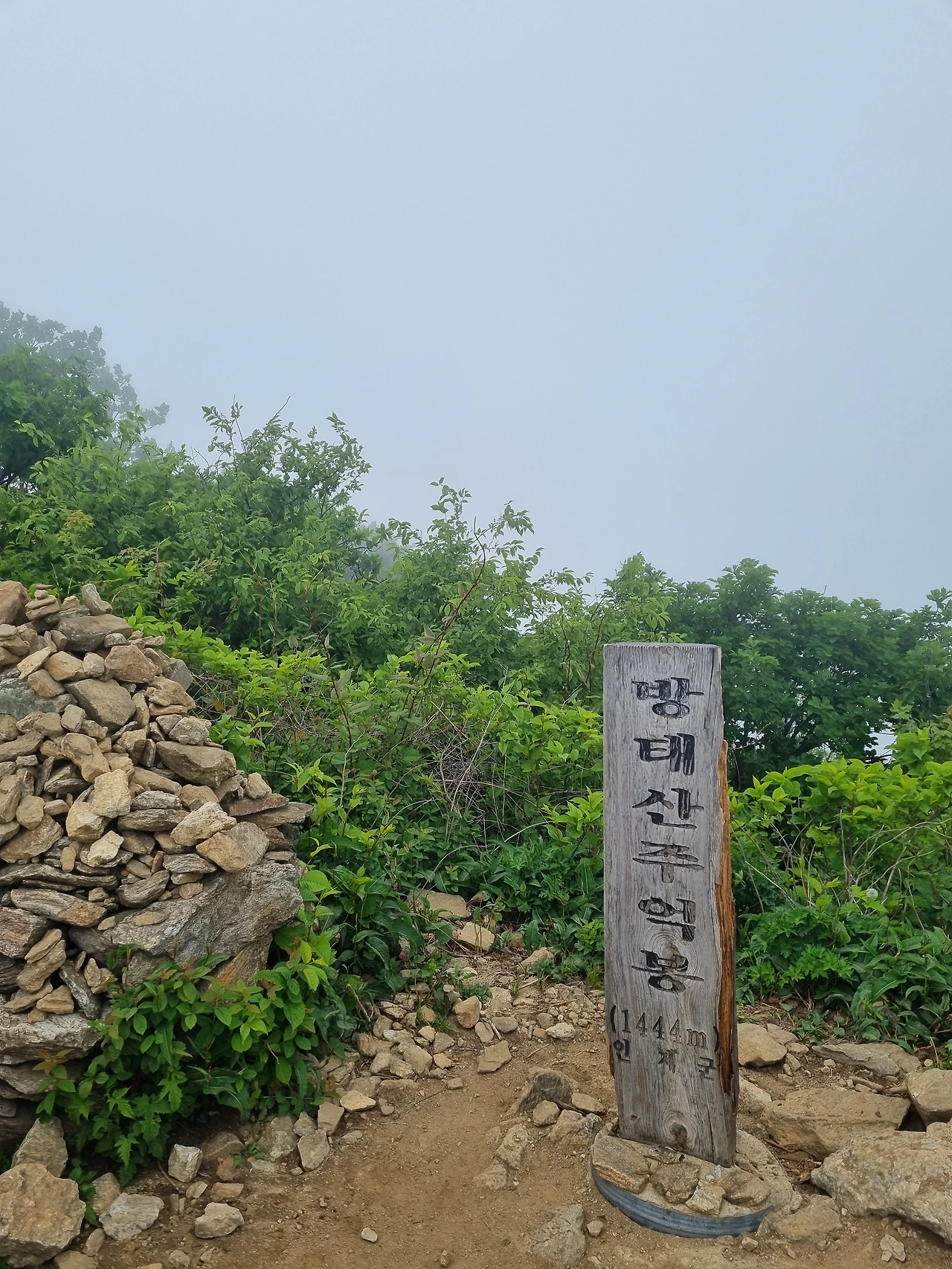 행여나 했지만 구름은 여전히 잔뜩 심술을 부리는 중이었고 정상석과 정상목에서 각각 인증사진을 찍고 이제 버스를 타러 하산.