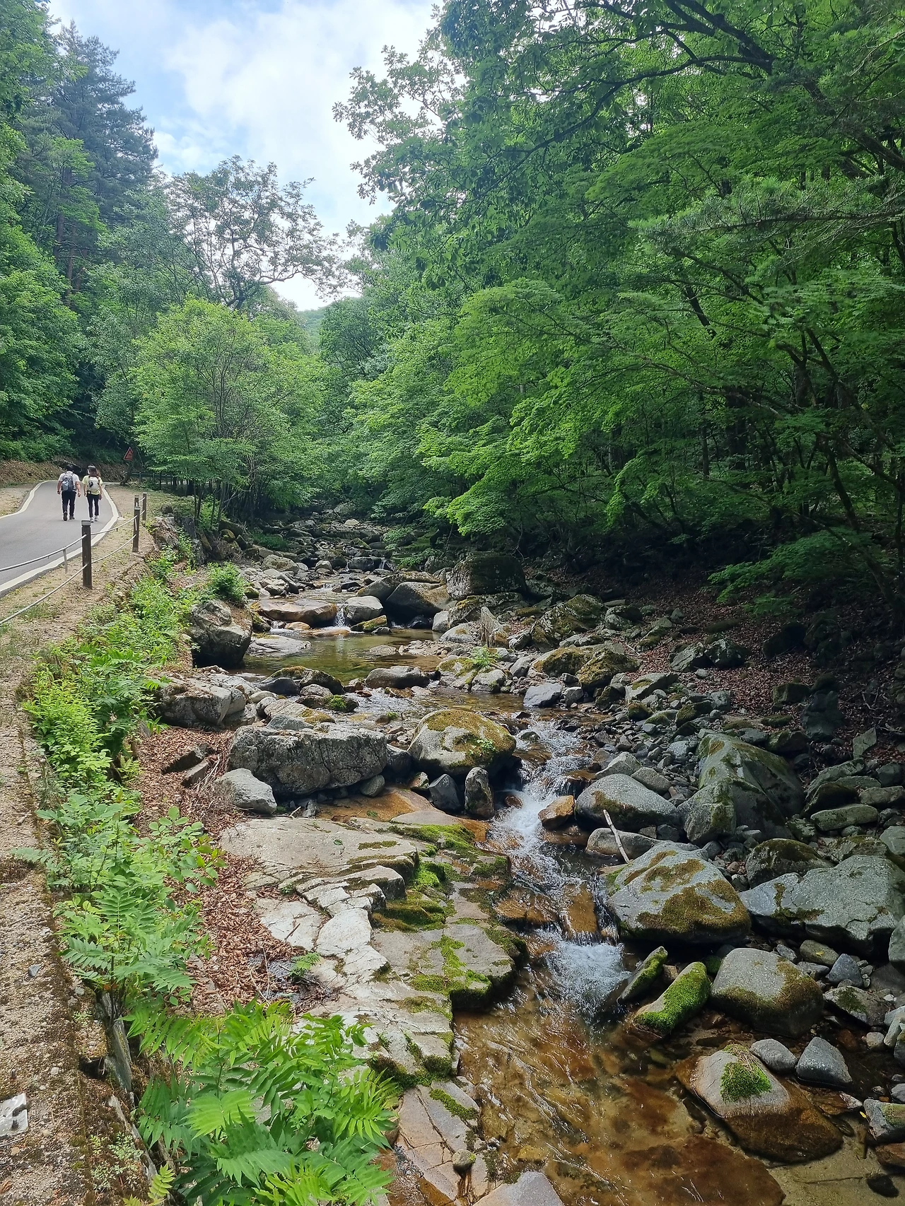 화장실에서 정비를 하고 계곡 옆 아스팔트 도로로 1km 넘게 야영장까지 걷고서야 2주차장 옆의 등산로에 진입한다.