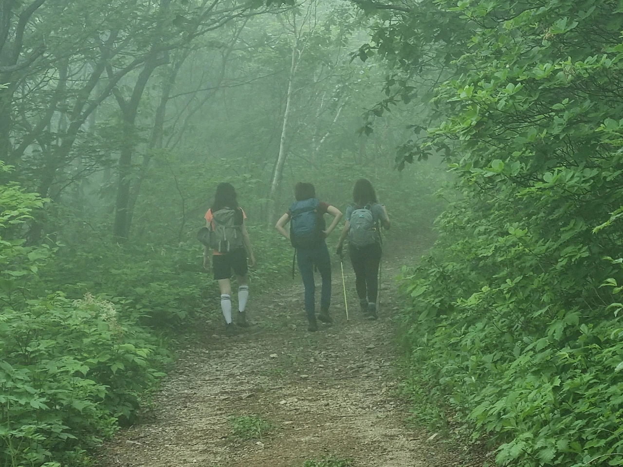 숨이 헐떡이는 가파른 언덕에 습식 사우나처럼 안개 가득한 숲길을 걷다 보니 땀이 비 오듯 흐른다.