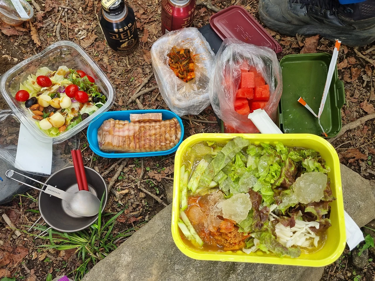 편육에 열무김치, 도토리묵사발과 샐러드로 맛나게 허기를 채우고 있는데 지나가시던 산객님 한 분이 우리를 뚫어져라 쳐다보신다.