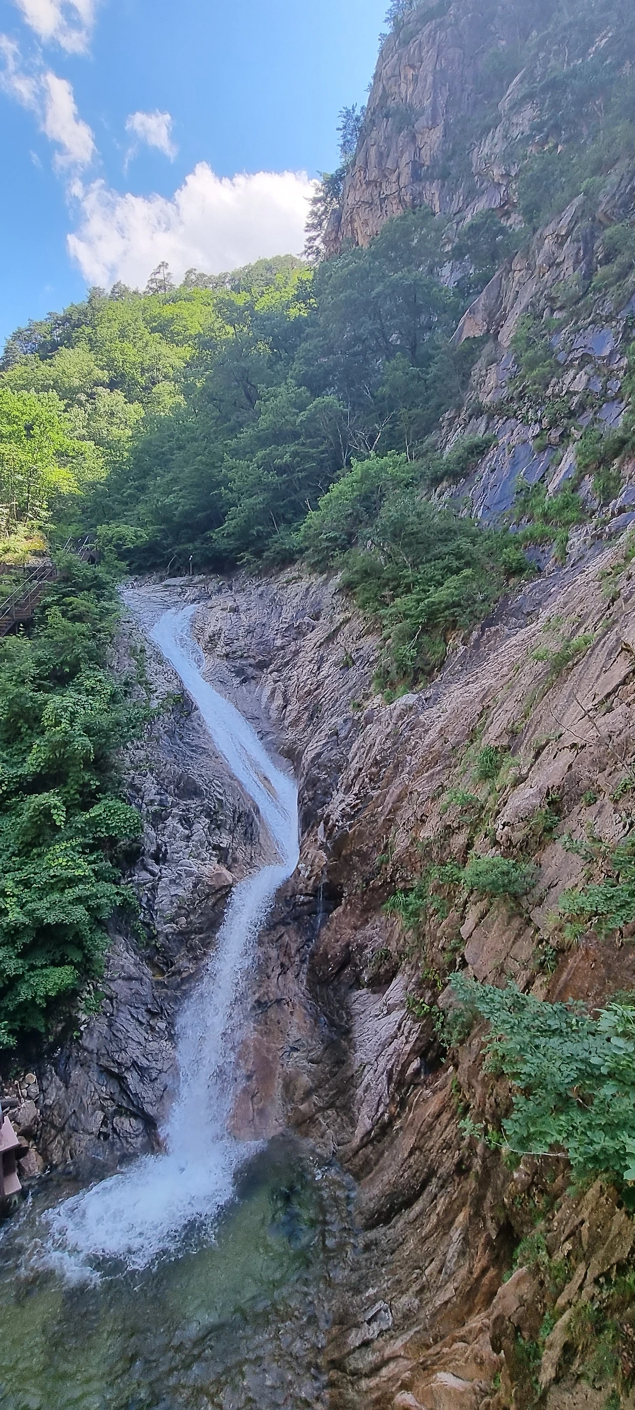 저 꼭대기에서 어떻게 저렇게 많은 물이 모여 떨어지나 신기하기도 하고, 긴 폭포의 장쾌한 물줄기에 감탄이 절로 난다.