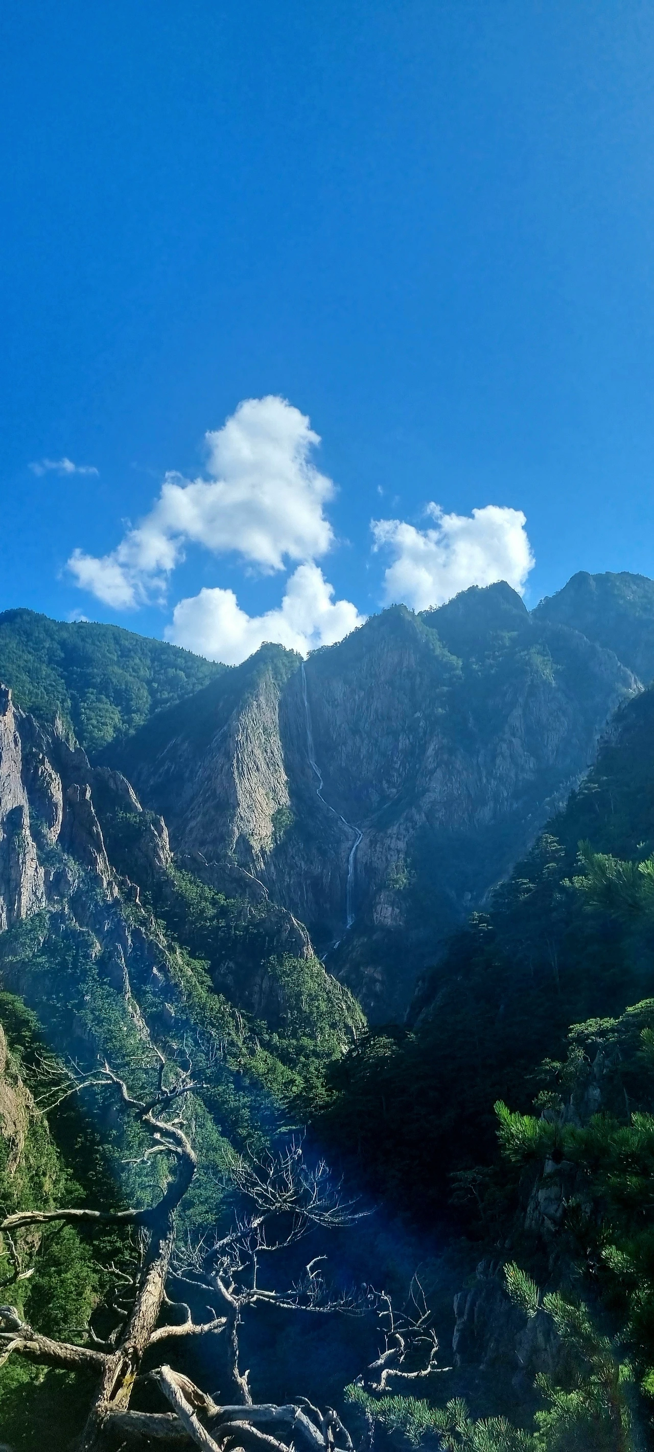 올라도 올라도 물소리가 나지 않아 좌절할 뻔했는데 생각보다 멀리서 바라보는 전망대인지라 쾌청한 하늘을 배경삼아 그 자태가 더욱 웅장하다.