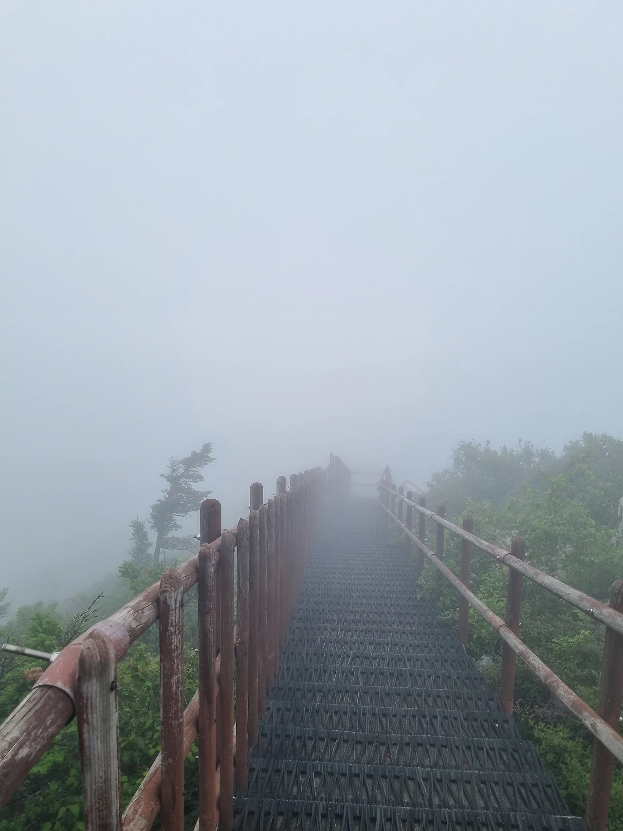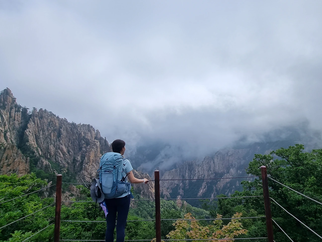 오늘 하산길은 어제의 그 구름바다 속으로 풍덩한 채 걷는 듯 시계가 흐렸지만 가끔 바람에 구름이 밀려 웅장한 속살을 내보여주기도 했고 뽀얀 안개가 나름 운치도 있었다.