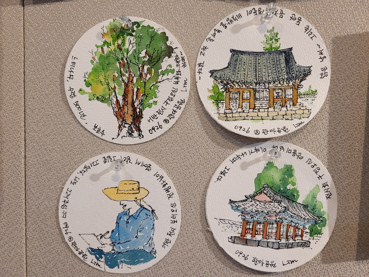 그런데 나와 다른 견해를 가진 분이 꽤 많다는 걸 깨달았다. 저널 북은 그림을 망쳤을 때 뜯어낼 수가 없어 마음이 편치 않다고 했다. 그 순간 그림을 걸 때의 상황이 이해되었다. 정제된 그림만 골라서 액자에 담아 보여주고 싶을 수도 있는 거였다. 아니, 오히려 그게 다수의 생각이었다. 우리 모임에는 정통 수채화, 한국화, 서예, 캘리그래피, 천 아트 등 어반 스케치 말고 다른 미술 활동에도 적극적인 분들이 많다. 그런 분들이 나처럼 가벼운 마음이기는 어려울지도 몰랐다. 더군다나 그런 분들 덕에 관람객은 낙서 같은 내 그림 말고 수준 높은 그림도 감상할 수 있다. 전시회 전날 잠시 화났던 마음은 모두 누그러졌다.
