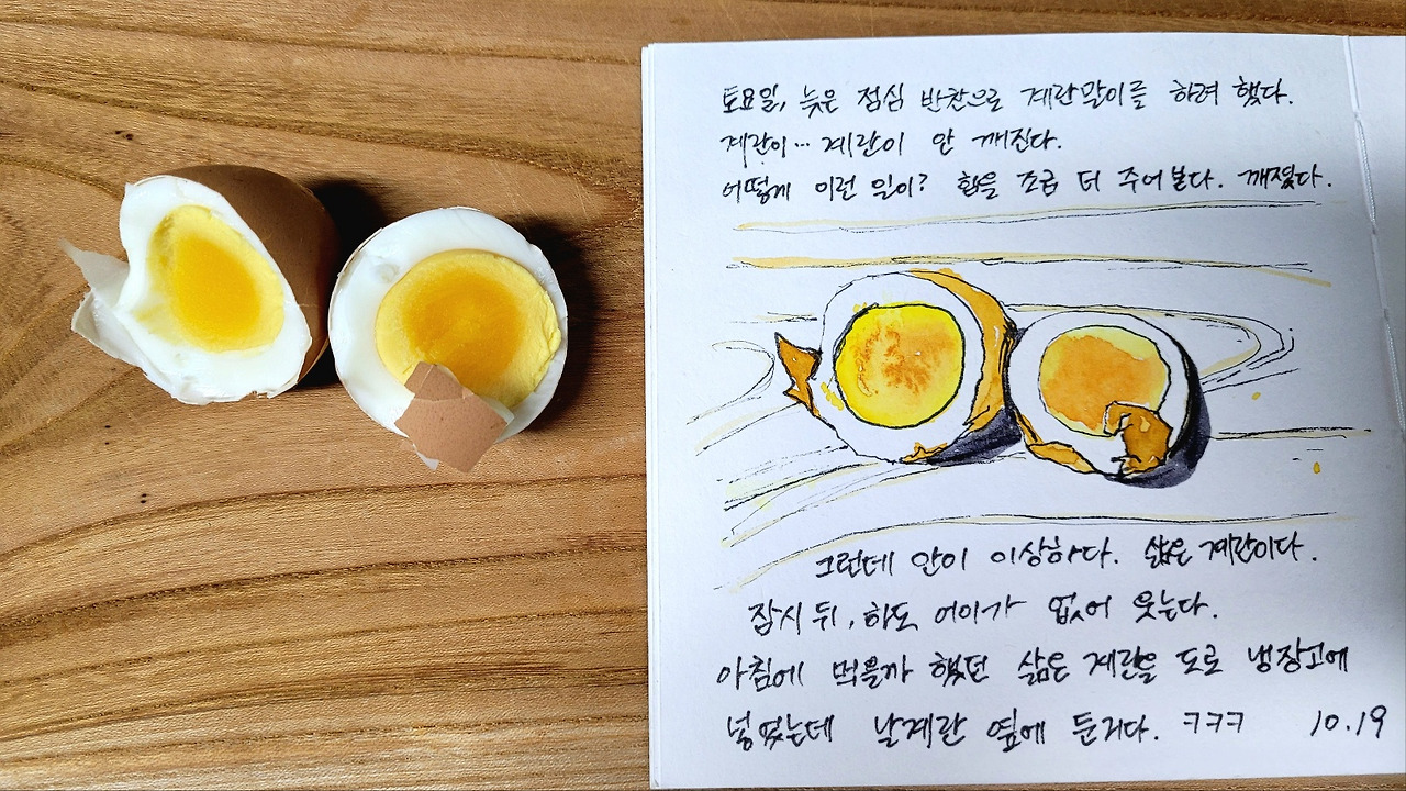 반찬으로 계란말이를 만들려고 냉장고에서 계란을 꺼냈다. 계란을 톡 쳤는데 살짝 이상했다. 힘을 조금 더 줘봤다. 계란이 깨졌다. 그런데 안이 이상했다. 삶은 계란이었다. 잠시 뒤, 하도 어이가 없어 웃음이 터져 나왔다. 아침에 삶아놨던 계란을 먹을까 하다가 도로 냉장고에 넣었던 게 기억났다. 그때 나도 모르게 날계란 옆에 둔 거다. 해외 출장으로 새벽에 공항으로 가는 남편을 챙기느라 그러기도 했겠지만 휴대폰을 냉장고에서 찾는다는 말이 남 일 같지 않았다. 나는 실실거리며 내게 한마디 했다. 정신 차리세요.