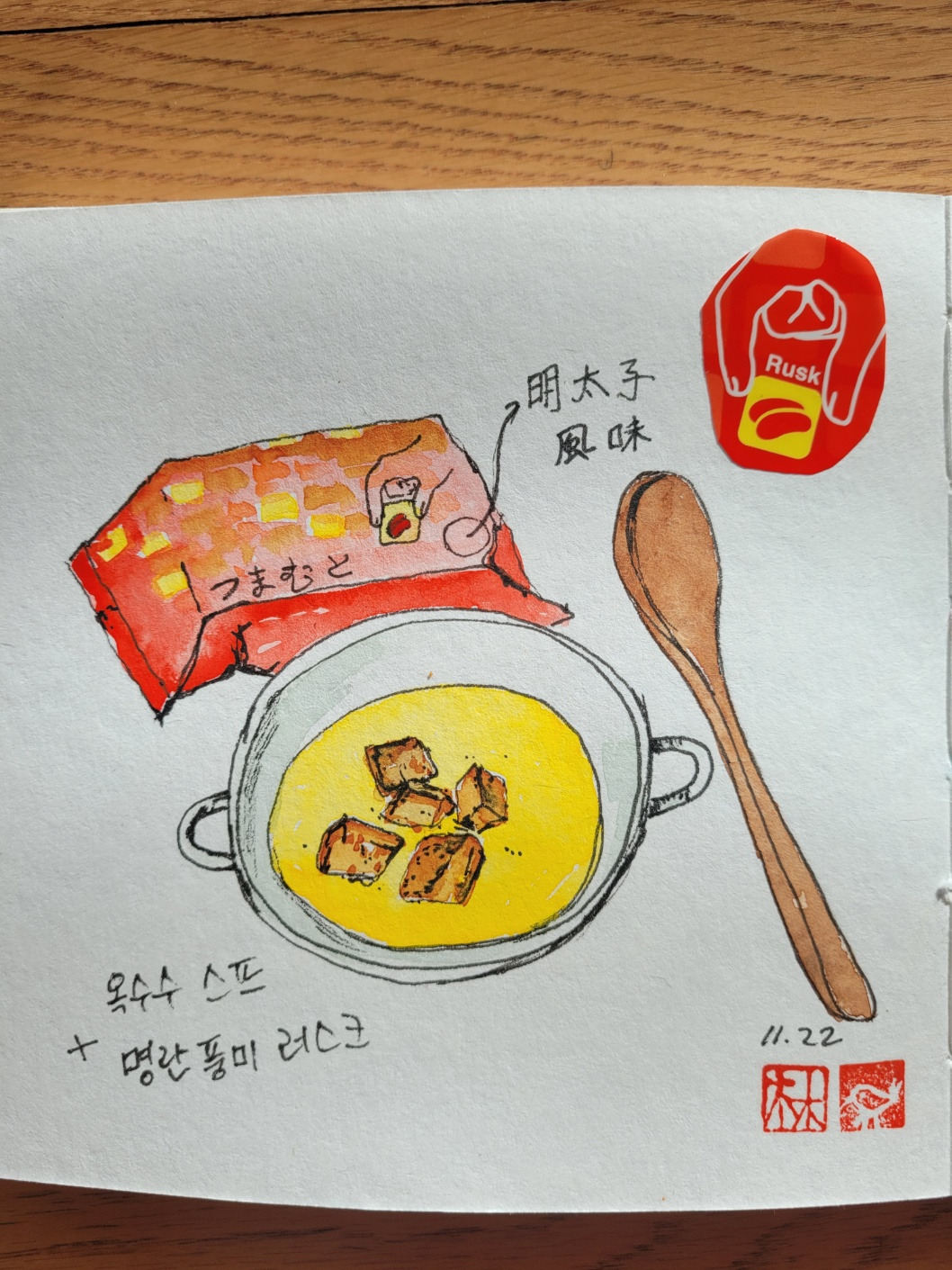 아무튼 명태는 원래 한국에서 잡혔던 생선이며 명란젓도 부산에서 먹기 시작했다고 한다. 남획과 수온 상승으로 현재 한국 바다에서는 잡기 어렵고 대신 일본해역에서 많이 잡힌단다. 남편이 가져온 먹거리 중에는 저 러스크 말고 명란젓도 있었다. 오래전부터 한국 음식인데 일본에서 사 오는 아이러니라니. 어쩐지 아쉬운 기분이 들었다.