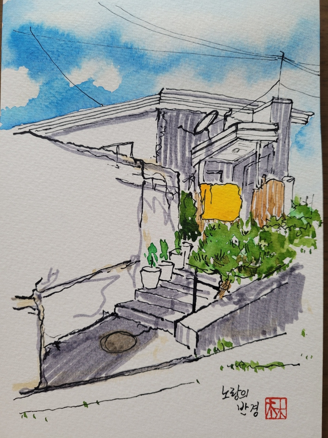 노란 수건은 거칠게 쌓아 올린 층계 위에 있는 집의 반쯤 열린 대문에 걸쳐져 있었다. 나는 오래된 집과 산뜻한 노랑의 대비가 마음에 들었다. 접이식 의자와 화구가방을 내려놓고 그 수건을 중심으로 주변을 살폈다. 어른 가슴 높이 정도 되는 대문 바로 안쪽, 대각선으로 마주한 철제문 두 개가 보였다. 하나는 현관, 다른 하나는 창고 같았다. 층계 옆 콘크리트 담장에는 거무튀튀한 얼룩이 가득했고 갈라진 틈새와 군데군데 덧바른 자국도 꽤 있었다. 그래도 담장 쪽 층마다 놓인 화분에 심은 고추는 싱그러웠으며 담장과 마주한 철제 난간 바깥쪽 오르막에는 작은 소나무가 있었다. 그 경사진 땅은 집 뒤편 텃밭으로 이어졌다. 곱게 돋은 이랑 위에 가지, 상추, 들깨 등이 보였다.