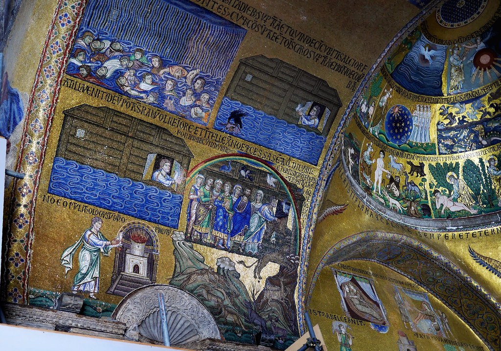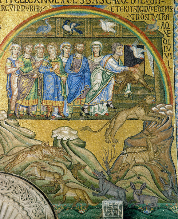 베네치아의 랜드마크인 산 마르코 성당(Basilica of San Marco, 11C)은 내부가 성경의 이야기와 성인들을 묘사한 황금빛 모자이크로 장식되어 있다. 성당 정문 입구와 본당 사이(나르텍스)에 묘사된 노아 연작은 오른쪽 둥근 지붕(큐폴라)을 장식한 천지창조 장면과 함께 이야기 전개와 표현력이 뛰어나다. 만화책처럼 구성된 노아 연작은 이제 누구나 쉽게 읽을 수 있을 것이다. 커튼처럼 비가 내리고 대홍수로 시체가 물에 둥둥 떠 있는 장면을 시작으로, 그 옆에 비가 멈추자 노아가 비둘기를 날려 보낸다. 비둘기가 나뭇가지를 물고 돌아오자, 이어진 장면에서 노아와 가족들이 방주에서 동물들을 땅에 내리고 있다. 세로로 확장된 이 장면에서는 하단에 뛰노는 암수 동물들뿐만 아니라 방주를 감싼 무지개가 눈에 띈다. 노아가 땅에서 가장 먼저 한 일은 맨 아랫단에서와 같이 제단을 쌓고 동물을 잡아 번제를 드린 것이다. 하느님은 향내를 기뻐 받으시고, 모든 동물들을 인간의 손에 맡기며 양식으로도 허용하셨다. 그리고 노아와 가족들, 모든 동물들에게 다시는 땅이나 생명을 멸망시키는 홍수를 일으키지 않겠다고 계약을 세우고, 계약의 표징으로 구름 사이에 무지개를 두셨다. 즉 세부 장면은 계약 전과 후의 장면이 결합된 것임을 알 수 있다. 결국 방주와 비둘기, 무지개는 창세기의 대홍수 이야기를 함축하는 모티프로 자리 잡게 된다.
