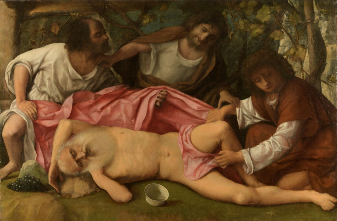 술 취한 노아와 함의 조롱은 의외로 여러 화가들이 다루었는데, 그 가운데 베네치아의 르네상스를 이끌었던 화가 조반니 벨리니(Giovanni Bellini, 1430〜1516)의 작품이 단연 돋보인다. 흰 수염이 덥수룩한 노아는 벌거벗은 채로 화면을 향해 누워 곯아떨어졌다. 포도밭을 배경으로 노아의 머리맡에 놓인 탐스러운 포도와 전경의 빈 컵은 그가 포도주에 취했음을 말해준다. 세 아들이 주변에 모여있는데, 중앙에 함은 아버지를 내려다보면서 조롱하듯 웃고 있다. 히브리어로 ‘알몸을 본다’는 표현은 ‘성행위를 하다’를 뜻하기도 해서, 이 일화는 함이 성적 희롱을 저지른 것으로 해석되기도 한다. 양쪽에 셈과 야펫은 눈길을 돌려 아버지의 몸을 분홍천으로 가리고 있는데, 가운데 함은 형제들을 두 손으로 만류하고 있다. 이후에 노아는 이 사실을 알고 자기를 욕되게 한 함에게 “가나안(함의 아들)은 저주를 받으리라. 그는 제 형제들의 가장 천한 종이 되리라”(창 9, 25)라고 말한다. 반면 아버지에 대한 존경심과 예를 지켰던 셈과 야펫은 그에 합당한 축복과 유산을 받게 된다. 이후 노아의 세 아들을 통해서 온 땅으로 사람들이 퍼져나갔는데, 함은 유대민족과 적대적이었던 가나안과 애굽의 조상이 된다. 큰 아들 셈은 유대민족이 속했던 팔레스티나와 메소포타미아 지방을 차지하고, 야펫은 그리스와 해변지역에서 번성했다고 한다. 결과적으로 노아의 저주는 역사적으로 이스라엘과 대치했던 가나안 사람들의 기원을 설명한다.