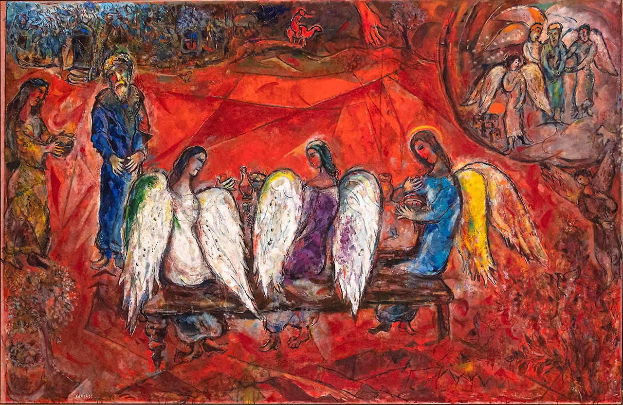 마르크 샤갈(Marc Chagall, 1887∼1985)의 <아브라함과 세 천사>는 샤갈이 말년에 그린 대형 유화 '성서 메시지 연작' 가운데 하나다. 화면 중앙에 천사들이 식탁에 둘러앉아 음식을 즐기고, 사라와 아브라함은 음식을 나르며 시중을 들고 있다. 이 그림은 독특하게 선홍색의 대지를 배경으로 하는 데다가 천사들을 마주 보도록 묘사하지 않았다. 흰색과 보라, 파란 옷을 입은 천사들은 가냘픈 실루엣에 아름다운 날개가 돋보인다. 오른쪽에 노란 날개와 후광까지 있는 파란 옷의 천사는 성부 하느님일 것이다. 가운데 천사는 여행길이 고됐는지 퉁퉁 부은 한쪽 발의 신발을 벗고 있다. 인간적인 특징이 드러난 이 천사는 성자, 흰옷을 입은 천사는 당연히 성령을 나타낼 것이다. 뒤쪽에 사건의 배경인 푸른 참나무 숲이 보인다. 뒤쪽 중앙에는 평생 하느님의 (손이) 이끄심을 따라 떠난 아브라함의 여정이 묘사되었다. 오른쪽 동그란 구 안에는 세 천사가 아브라함을 부추겨 걷는 모습이 보인다. 이후 소돔과 고모라의 멸망을 예시하는 것이다.