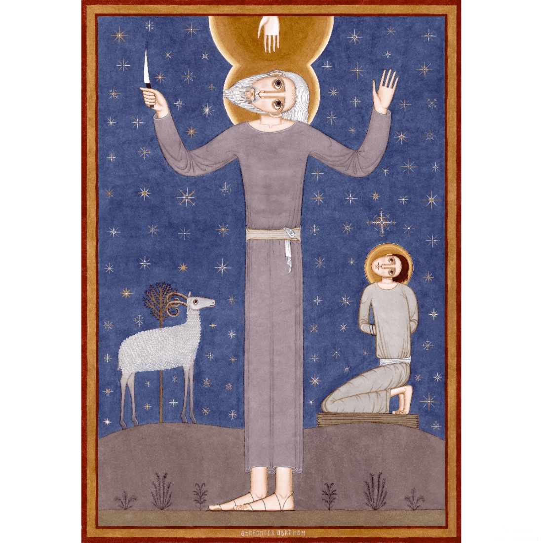 한 손에 칼을 쥔 노인이 두 팔을 들고 하늘을 바라고 있다. 그의 좌측엔 덤불에 걸린 숫양이, 우측엔 한 소년이 결박당한 채 제단 위에 무릎을 꿇고 있다. 소년의 얼굴 주변에 후광과 그 위에 가장 크게 빛나는 별이 눈에 띈다. 군청색으로 물든 아름다운 밤하늘에 수많은 별들이 반짝인다.