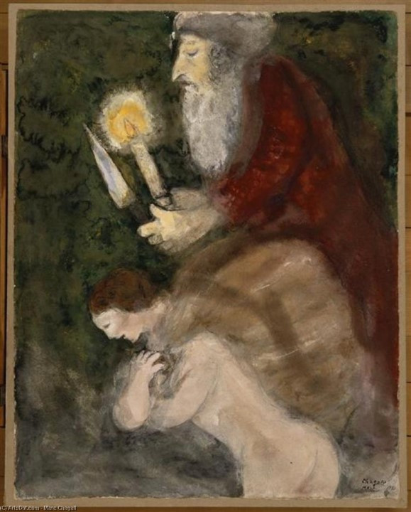 아브라함은 여전히 나그네살이하였다. 어느 날 하느님은 아브라함을 시험해 보시려고 아들 이사악을 데리고 가서 그를 번제물로 바치라고 명하셨다. 아브라함은 아침 일찍 번제물을 사를 장작을 팬 뒤, 나귀를 끌고 두 하인과 이사악을 데리고 길을 떠났다. 사흘째 되는 날 아브라함이 눈을 들자 그곳을 볼 수 있었다. 하인들에게 나귀와 머무르게 하고, 아브라함은 장작을 이사악에게 지우고 손에 불과 칼을 들고 함께 걸어갔다. 이 장면을 묘사한 마르크 샤갈(Marc Chagall, 1887∼1985)의 성서 삽화는 역시나 시적이다. 악몽과도 같은 명령에 아브라함은 차마 눈도 뜨지 못하고 묵묵히 걸어간다. 맨몸에 커다란 장작 꾸러미를 이고 가는 이사악도 힘겨워 보인다. 초기 그리스도교 교부인 아우구스티누스(354~430)는 장작을 지고 가는 이삭을 십자가를 지고 골고다 언덕을 오르는 예수와 연결시켰다. 부자의 마음은 배경처럼 깜깜 할 텐데, 함께 걷는 그들의 모습에서는 이상하게 평온함마저 느껴진다. 이사악은 곧 아버지에게 물을 것이다. “불과 장작은 여기 있는데, 번제물로 바칠 양은 어디 있습니까?” “애야, 번제물로 바칠 양은 하느님께서 손수 마련하실 거란다.”(창 22:7-8) 하느님에 대한 절대적인 믿음, 아버지에 대한 깊은 순종이 이 그림에 스며들어 있다. 둘은 한마음이었다.