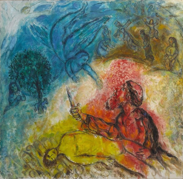 샤갈의 작품은 렘브란트의 그림과 비슷한 맥락에서 그려진 것을 알 수 있다. 이사악은 고민하는 아버지의 마음을 읽고 번제의 제물이 되기를 선택한 것이다. 스스로 희생양이 된 이사악은 상단의 십자가를 진 예수 그리스도를 예시하기도 한다. 아들을 죽음에 몰았던 아브라함은 이 땅에 희생양으로 예수를 보낸 하느님과 겹쳐 보인다. 러시아 태생의 유대인 샤갈은 유대 경전 『토라』에 익숙한 데다 그리스도교의 해석도 혼합해 표현했기 때문에 보기보다 그림 읽기가 쉽지는 않다. 상단에 십자가를 진 예수 옆에는 모자를 쓴 유대인이 경전 『토라』를 들었고, 두 손을 들고 기도하는 여인은 홀로코스트의 어두운 그림자를 연상시킨다. 샤갈은 한 걸음 더 나아가 십자가에 희생된 예수를 홀로코스트로 무참히 짓밟힌 자기 민족과도 연결시켰다.