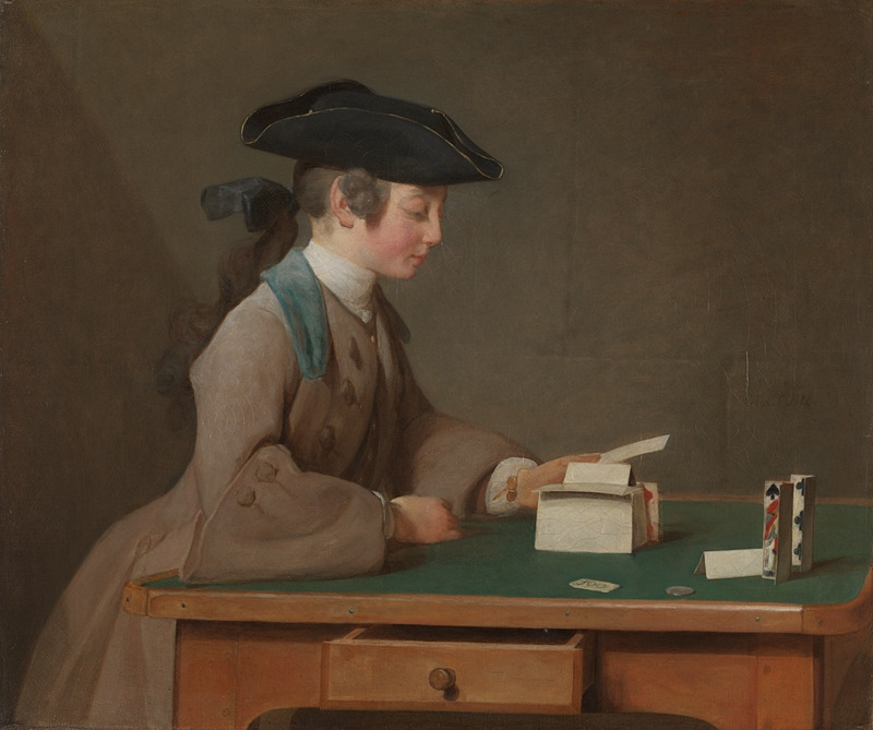 탁자 앞에 선 소년이 카드로 집을 짓고 있다. 팔뚝을 올리고 몸을 살짝 기울인 채, 다음 카드를 손에 쥐고 고민한다. 어떻게 더 높이 쌓을 수 있을까. 몇 번의 실패 후에 손길은 더욱 신중해졌을 것이다. 발그레한 볼은 소년이 얼마나 열중해 있는지를 보여준다. 탁자에 놓인 카드와 동전, 칩 같은 것은 앞에 열린 서랍에서 꺼냈을 것이다. 앳된 소년의 어른스러운 패션도 시선을 끈다. 18세기 파리에서 유행했던 프록코트에 삼각모자, 리본을 맨 긴 머리와 양 옆에 곱슬머리까지, 세심한 보살핌을 받은 넉넉한 집안의 아이일 것이다. 이 작품은 샤르댕의 절친한 친구이자 가구 장인이었던 장 자크 르누아르가 의뢰한 아들의 초상이다.