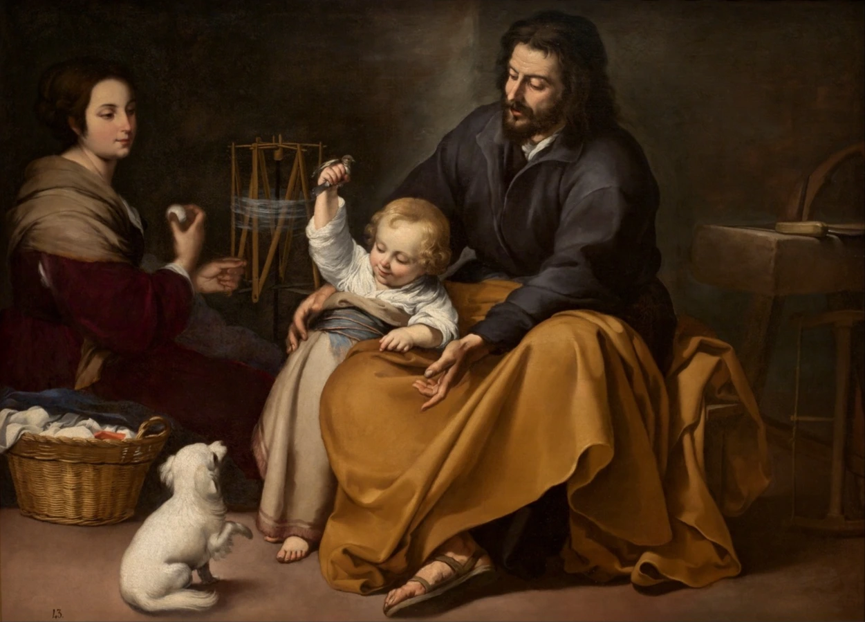 무리요가 유명해지기 시작했던 1650년경의 <작은 새가 있는 성가족>을 살펴보자. 작은 새를 손에 쥔 귀여운 아기 예수는 아버지 요셉에게 기대어 강아지와 놀고 있다. 오른쪽에 놓인 장비들은 요셉이 목수임을 알려주는 동시에 예수가 미래에 겪게 될 고난을 암시한다. 반짇고리를 앞에 두고 실을 잣는 마리아는 근면하고 자애로운 어머니로 묘사되었다. 이 그림은 위엄 있는 성화라기보다 당시 이상적인 서민 가정의 모습을 담아낸 것처럼 보인다. 5년 전에 결혼해 여러 자녀를 두었던 화가에게 이런 풍경은 낯설지 않았을 것이다. 무엇보다 이 작품은 성가족의 일상을 자연스럽고 따듯한 시선으로 그리면서 부모의 사랑과 역할을 표현했다는 점이 주목된다.