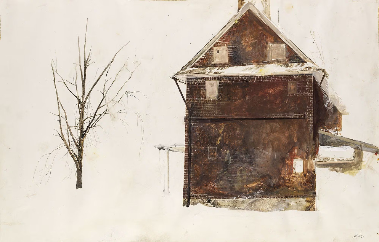 템페라 작업을 위해 와이어스는 보통 수십 점의 드로잉과 수채화 연구를 거쳤다. 수채화 <소작농을 위한 벽돌집 연구>는 템페라 완성작과는 다른 매력으로 인기 있는 작품이다. 헐벗은 나무와 벽돌집을 나란히 그렸는데, 미완과 여백의 아름다움이 겨울 풍경과 어울린다. 벽돌집은 섬세하게 묘사된 부분도 있지만, 자유롭고 즉흥적인 붓질과 닦아내고 긁은 흔적도 보인다. 와이어스는 건물의 외관뿐 아니라 건물의 역사와 거주자들에게도 매료되곤 했다. 그는 영감을 받은 대상을 천천히 관찰하고 깊이 몰입하며 느꼈던 감정과 표현력을 전달하기 위해 다양한 표현을 시도했다. 꼼꼼한 완성작과 다른 스케치는 자유롭고 생동감이 있다.