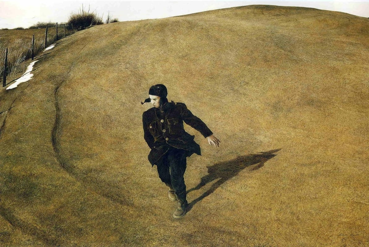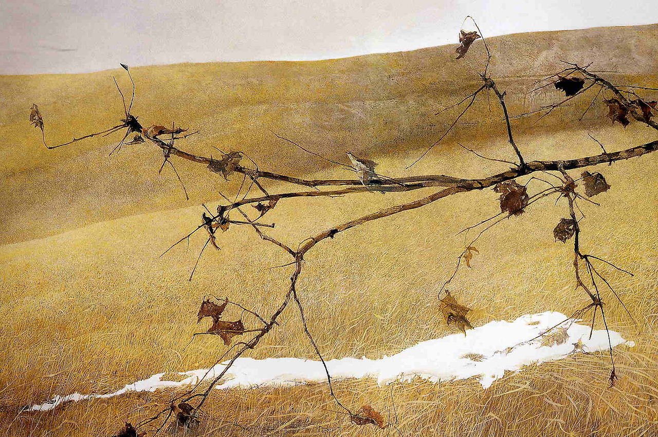 1940년에 결혼해 아이를 둔 스물여덟의 화가에게 비극은 갑자기 찾아왔다. 1945년 가을, 아버지와 세 살 조카가 집 근처 철로에서 차가 고장 나 열차에 치여 사망한 것이다. 다복한 가족의 행복과 낙관주의는 갑자기 무너졌다. 아버지의 죽음은 한편으로 와이어스의 작업에 오히려 새로운 생명을 불어넣어 진지한 주제에 몰두하게 만들었다. 그해 겨울 내내 그린 <1946년 겨울>에서 한 소년이 황톳빛 언덕을 가로지른다. 와이어스에 따르면 침울한 소년은 혼란에 빠진 그였고, 허공에 떠 있는 손은 더듬거리는 자유로운 그의 영혼이었다. 사고가 난 철로가 언덕 뒤편에 있었기에, 이후 언덕은 아버지와 죽음을 암시하기도 했다.