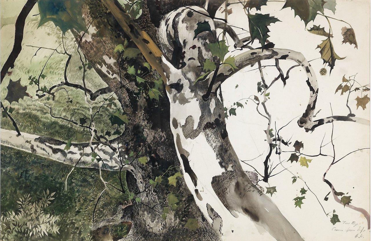 템페라로 그린 <펜실베이니아 풍경>의 중심에는 복잡하게 가지를 뻗어낸 플라타너스가 서 있다. 잎을 거의 다 떨군 가지와 줄기에는 이 나무만의 얼룩덜룩한 무늬가 있다. 낮은 언덕 위에 고목은 보는 이를 포획할 듯이 강렬한 존재감을 내뿜는다. 뒤쪽에 색색으로 펼쳐진 브랜디와인 밸리는 미국독립전쟁 시기 브랜디와인 전투(1777)의 현장이고, 왼편의 집은 전투의 본부로 사용되었다. 400살이 넘는 플라타너스는 전투는 물론 이곳의 긴 역사를 지켜본 터줏대감이다. 근처에서 흐르는 작은 강물은 실제 멀리 떨어져 있다고 한다. 마치 공중에 떠서 바라본 듯한 모습은 화가가 여러 요소들을 합성해 만들어낸 고향 풍경이다.