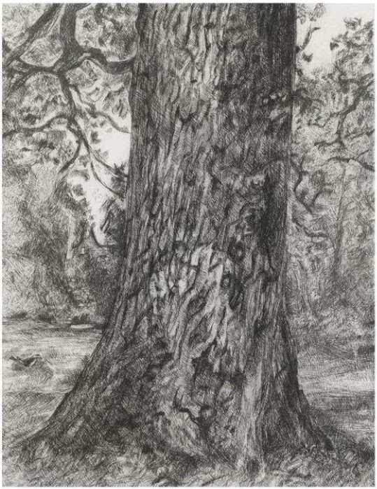 <건초 마차>와 같은 해에 제작된 <느릅나무 몸통 연구>에 나처럼 깊은 인상을 받은 화가가 있었다. 독일에서 나치를 피해 영국에 귀화한 17살의 루시언 프로이트(Lucien Freud, 1922~2011)는 미술관에서 그림을 보고 모사하려고 했지만 너무 어려워 포기했다고 한다. 이후 영국을 대표하는 초상화가로 자리매김한 그는 마음속에 자리한 이 작품을 80세경에 에칭으로 제작했다. 크기는 비슷하지만 판화라 좌우가 바뀌었고 원본과 약간 다르게 묘사되었다. 유화의 색채와 물질성을 느낄 수는 없지만 프로이트는 거친 선과 흑백의 강렬함으로 컨스터블의 느릅나무를 부활시켰다.
