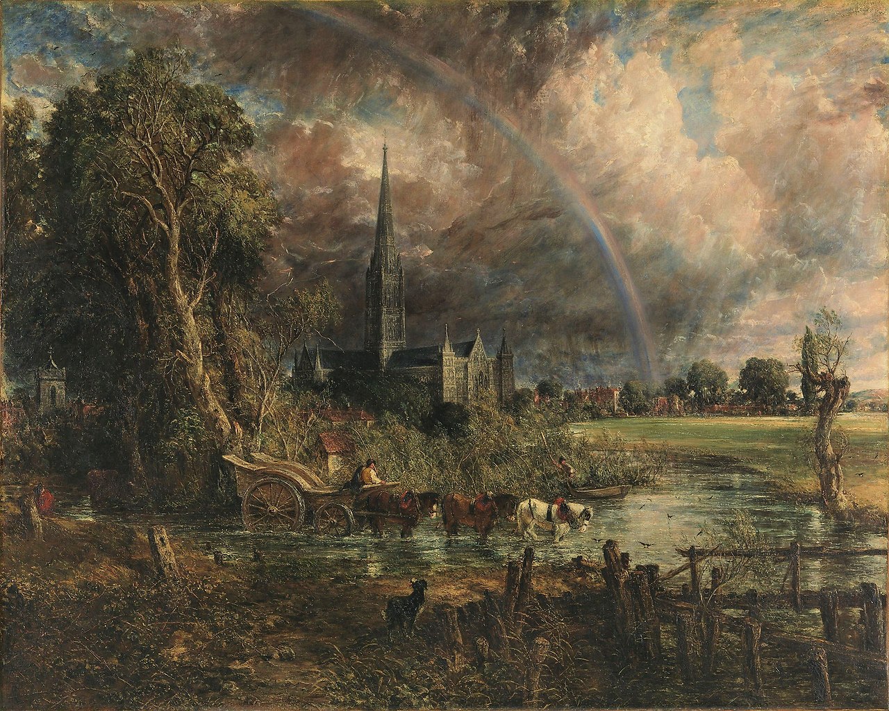 아내가 죽은 지 3년 후에 제작된 걸작 <목초지에서 본 솔즈베리 성당>을 보면 화가의 마음이 얼마나 황폐해지고 어두워졌는지 느낄 수 있다. 불길한 기운이 감도는 구름과 잿빛을 띈 성당이 멀리 보이고, 가지가 잘려나간 나무들과 주변의 무성한 잡초들은 생기를 잃고 말라 있다. 왼쪽 중경에 보이는 무덤 표지는 아내의 죽음을 암시하는 듯하다. 하지만 교회가 상징하는 믿음과 부활, 그리고 하늘에 희미하게 드러난 무지개와 햇살이 폭풍우 같은 감정의 격변 이후에 다가오는 희망을 암시한다. 컨스터블에게는 아직 일곱 아이들이 있다.