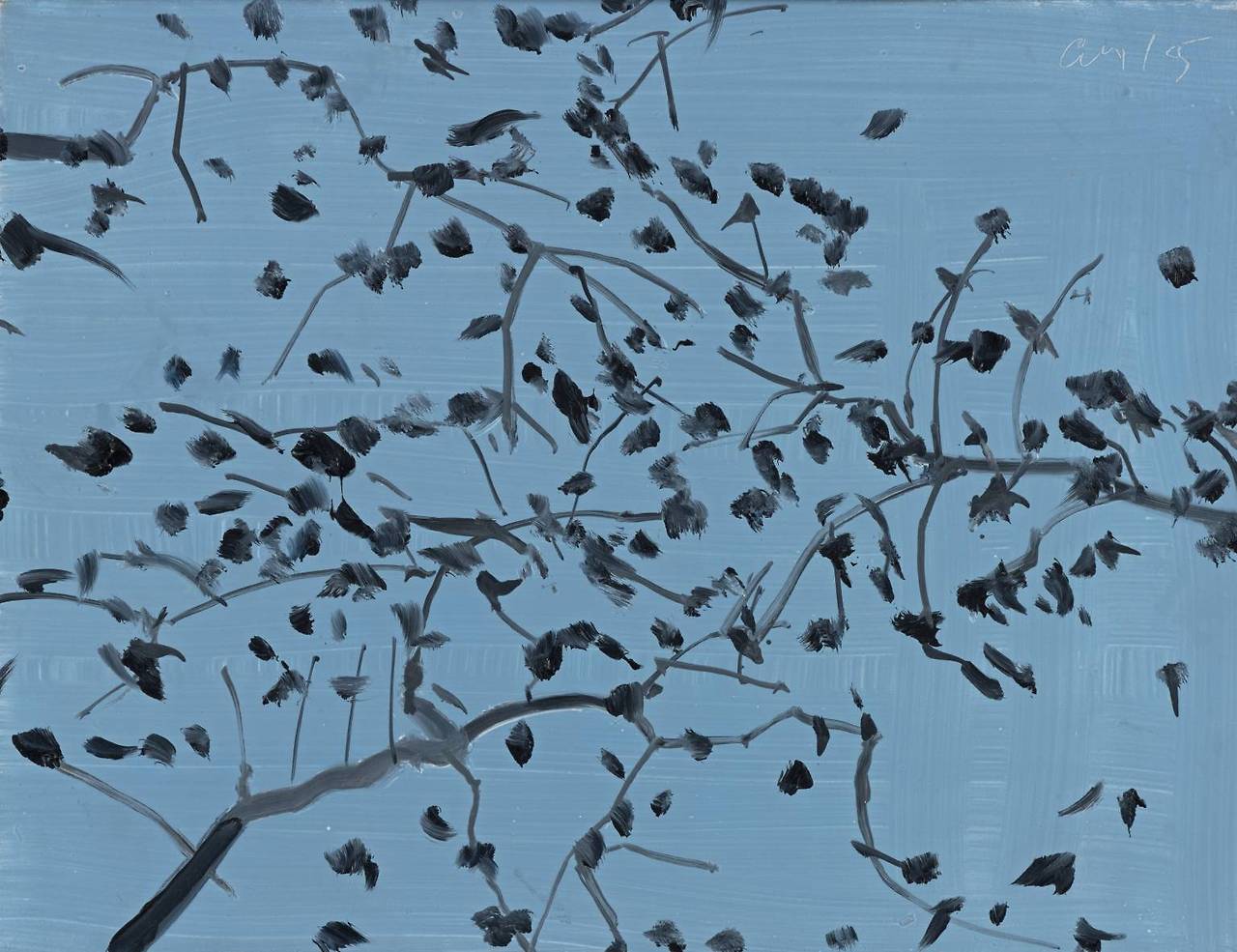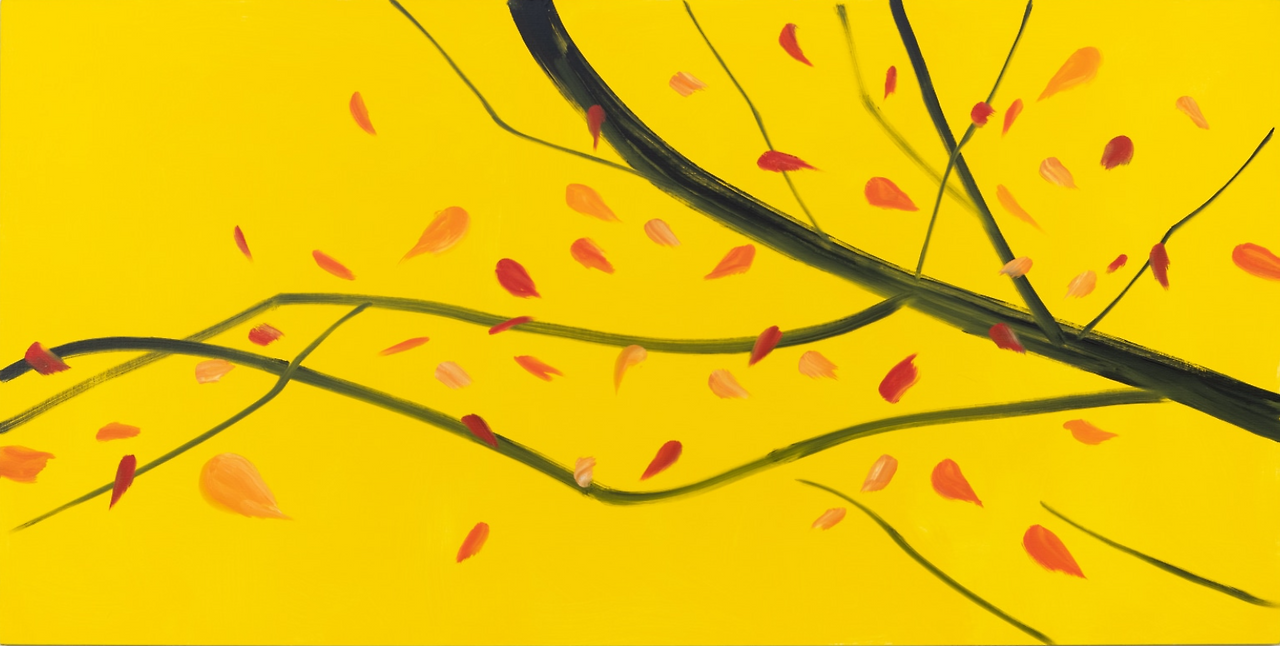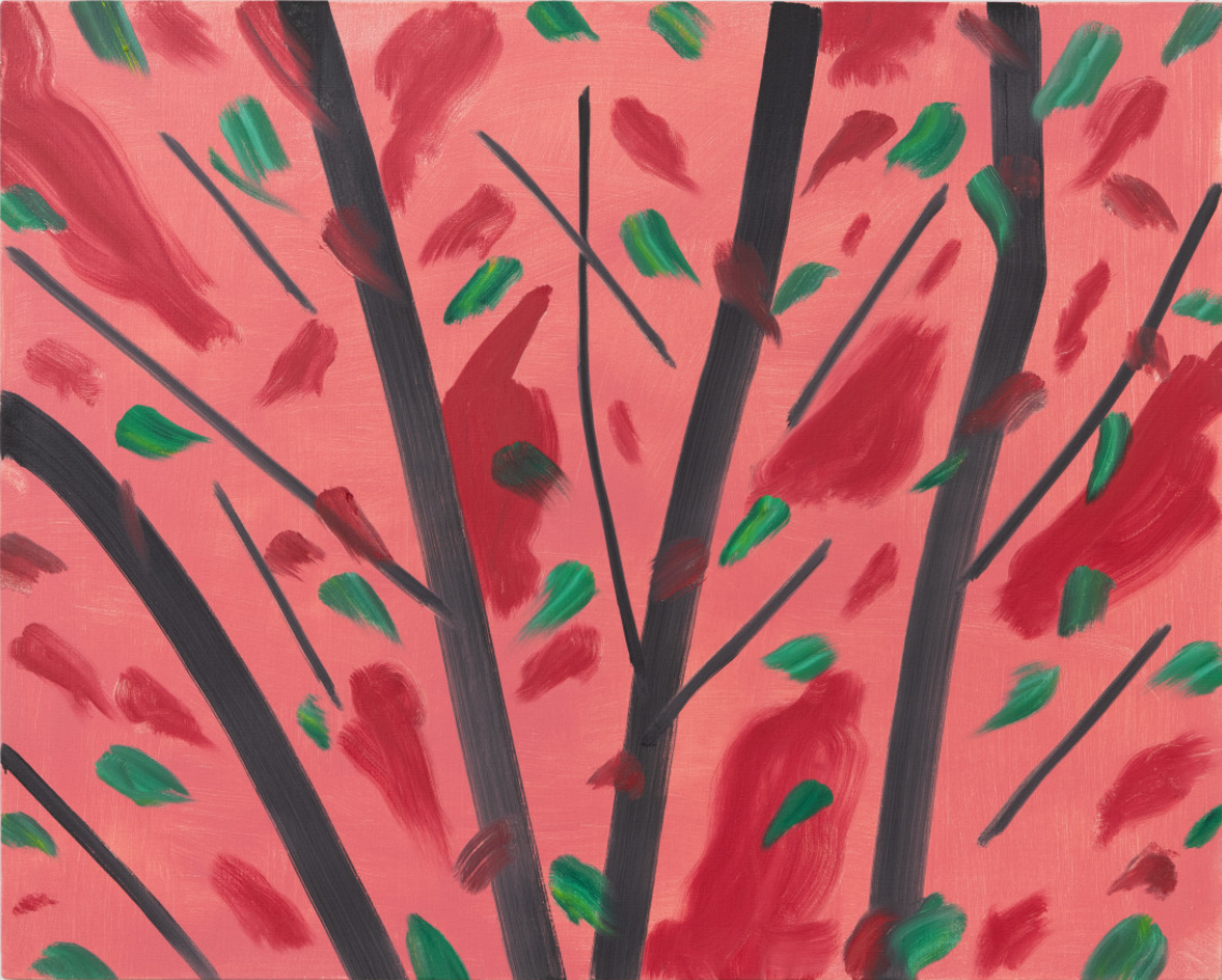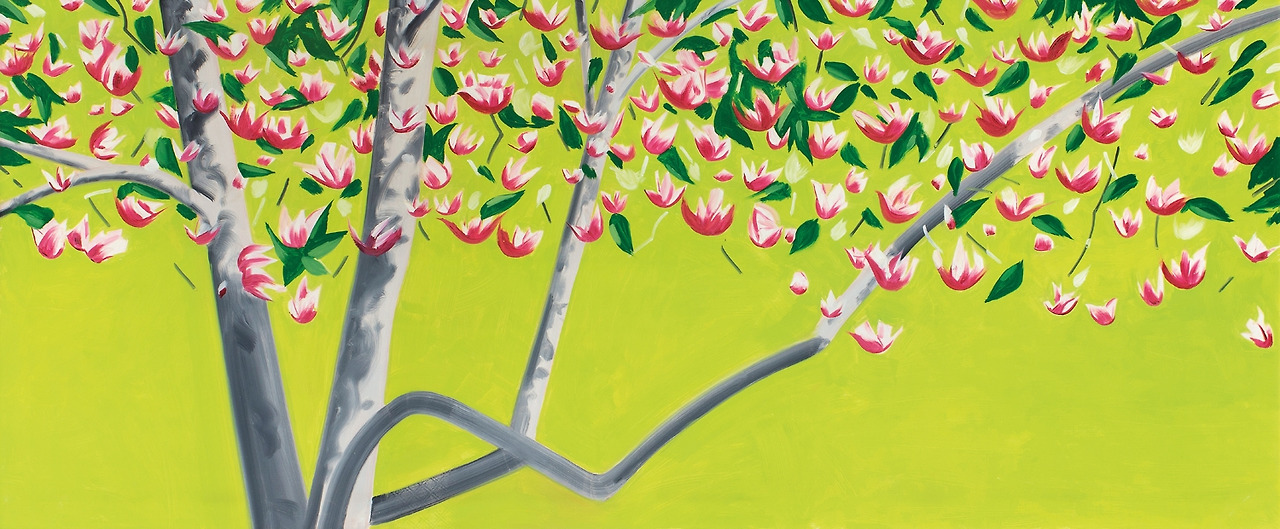 경력 초반에 집중했던 인물화로 카츠는 1970년대부터 평단의 주목을 받기 시작했고, 1986년 휘트니 미술관에서의 회고전으로 가장 뉴욕적인 화가로 자리매김한다. 1990년대부터 카츠는 꽃과 나무, 풍경화에 더욱 집중하며 순간의 인상과 에너지를 전달하는 형식을 연구했다. 카츠는 70년을 넘게 거의 매일 작업한 데다 작업 속도도 빨라 작품수가 엄청나다. 게다가 인기 있는 작품은 색채나 구성, 크기를 변주하거나 판화로 반복 제작하기도 했다. 나무 그림도 그 수와 스펙트럼이 넓어 계절별로 몇 점의 유화만 선정해 살펴보려고 한다. (나의 감각으로 구분한 것이기 때문에 보는 사람에 따라 다른 계절과 시간으로 읽을 수 있다)